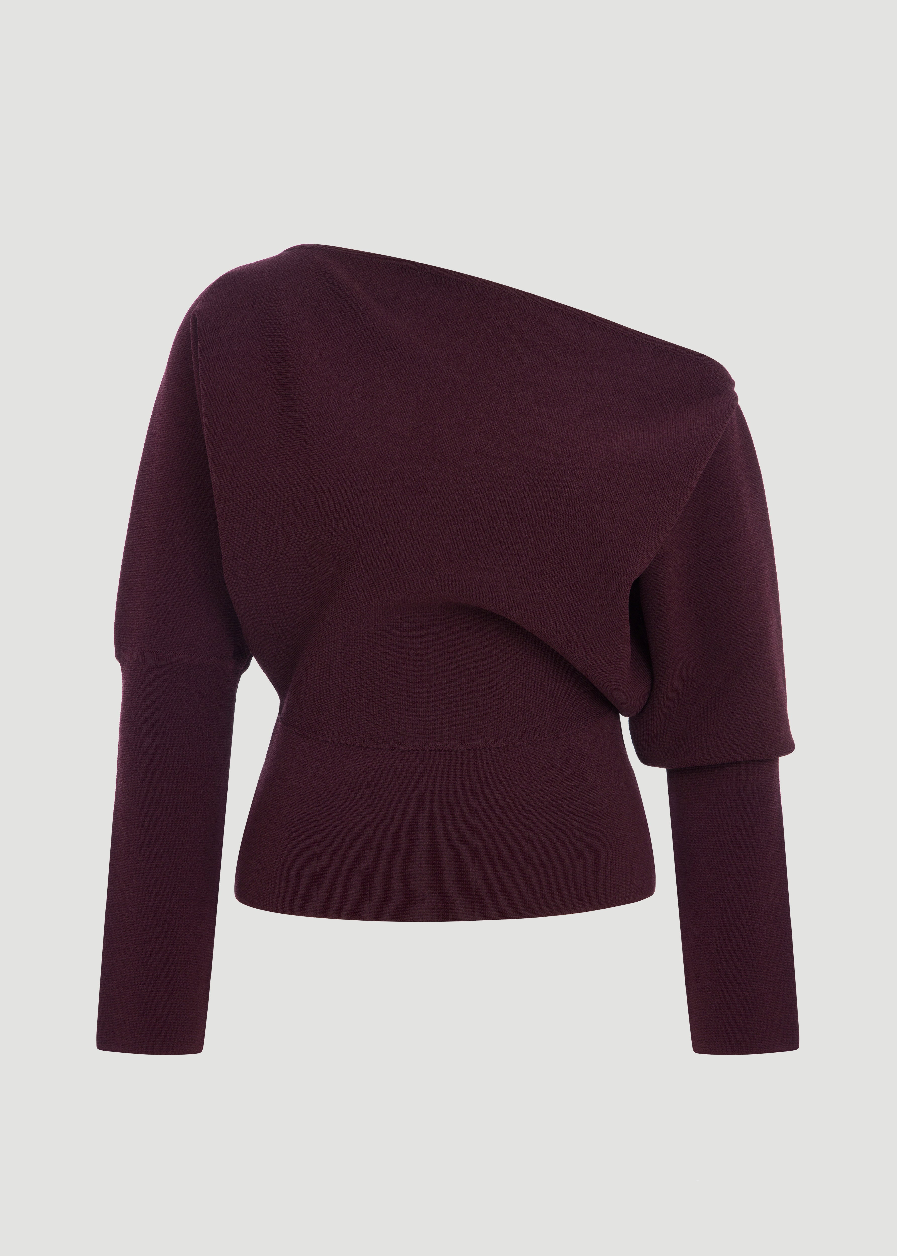 One shoulder, long-sleeved blouse that fits at the waist.