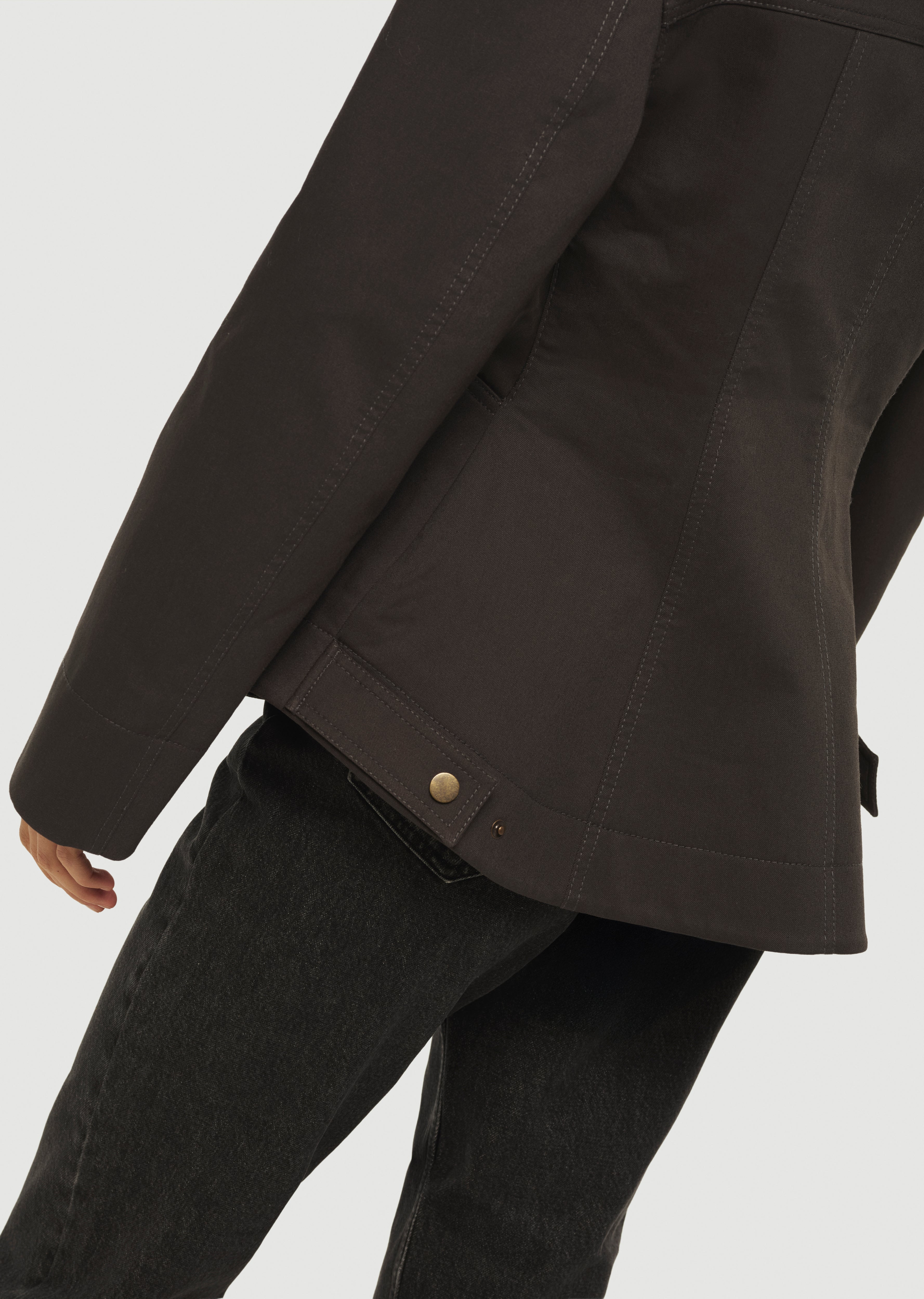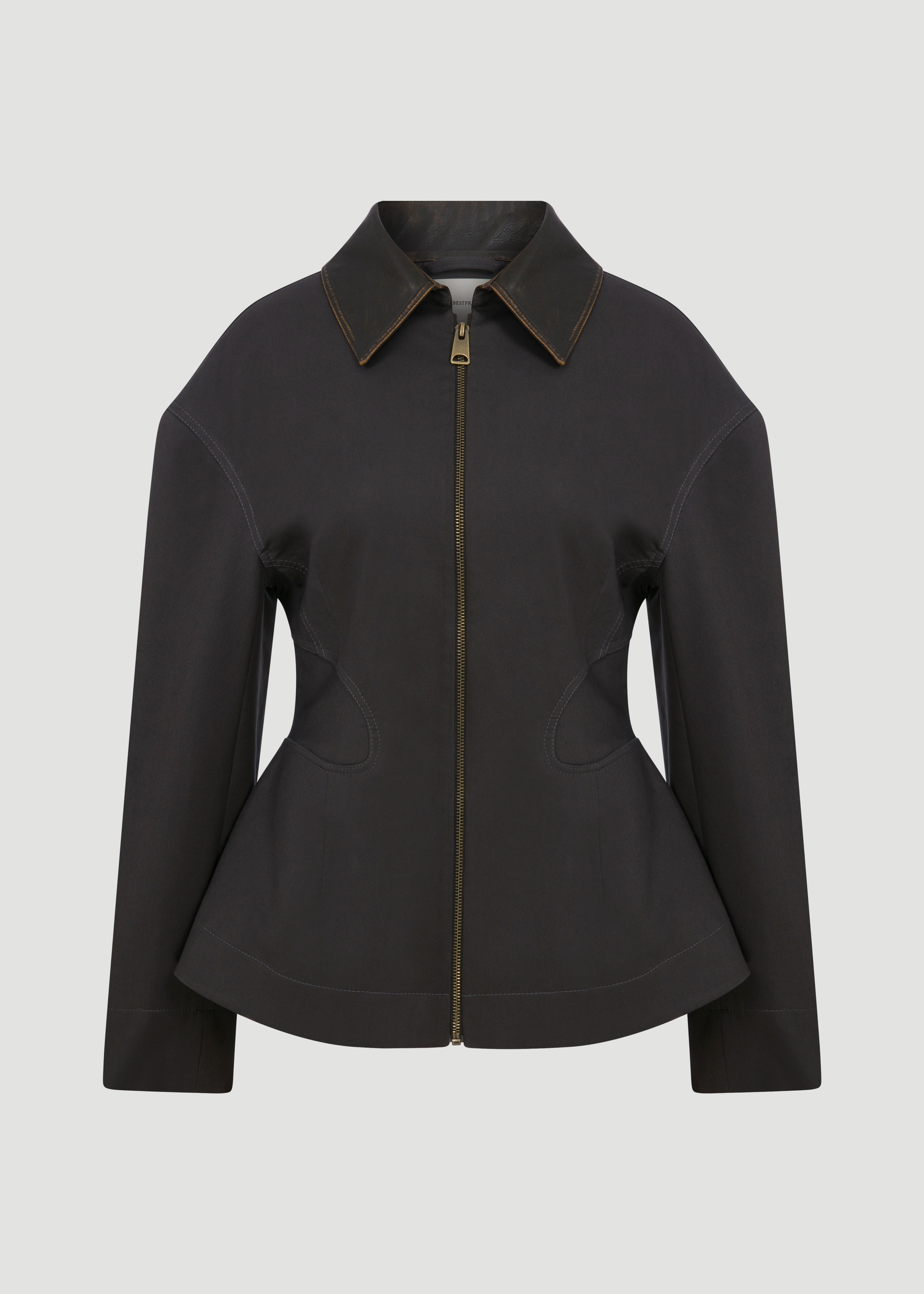 Low shoulder, waist-fitting, zipper-closure, leather-collared gabardine jacket.