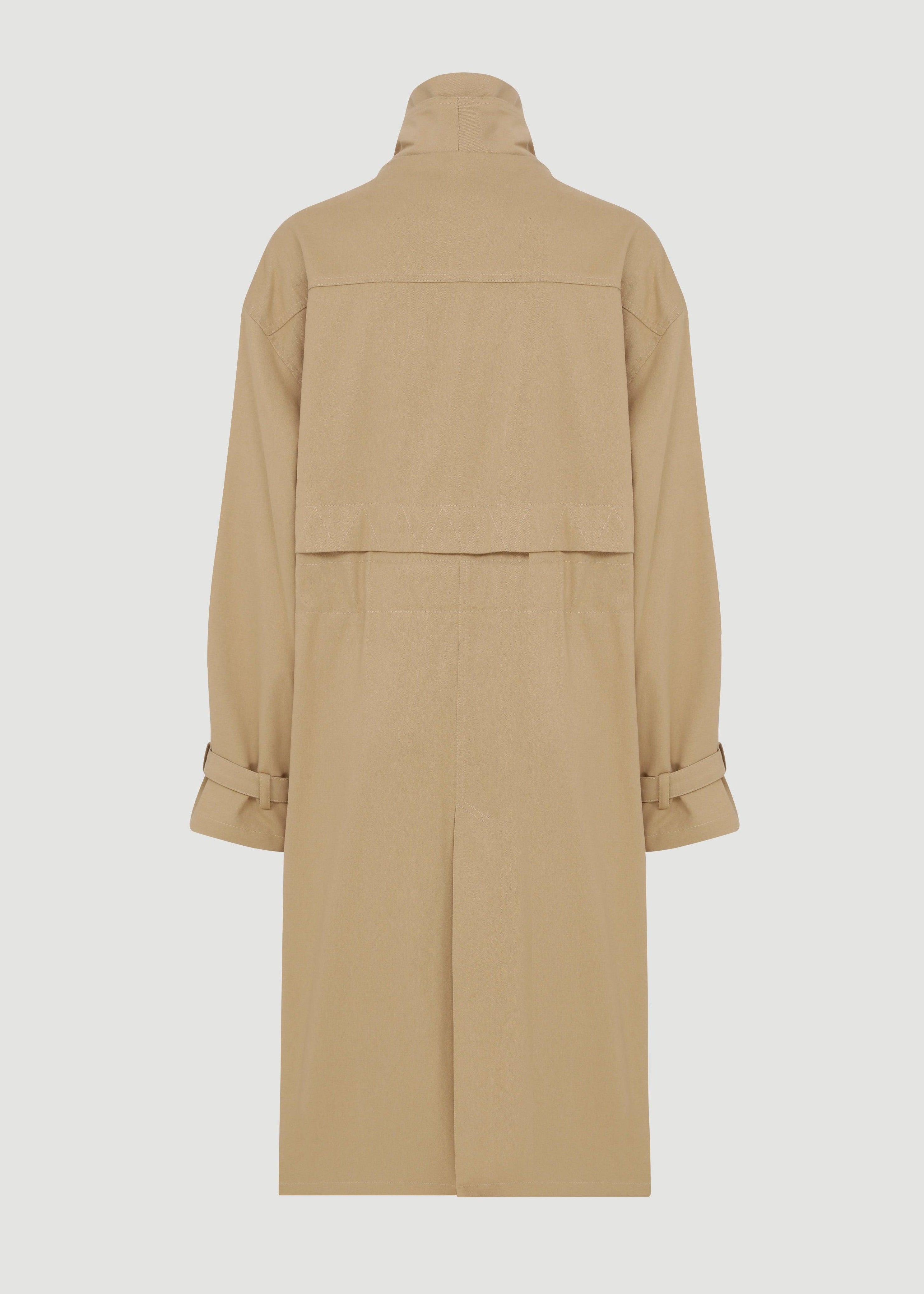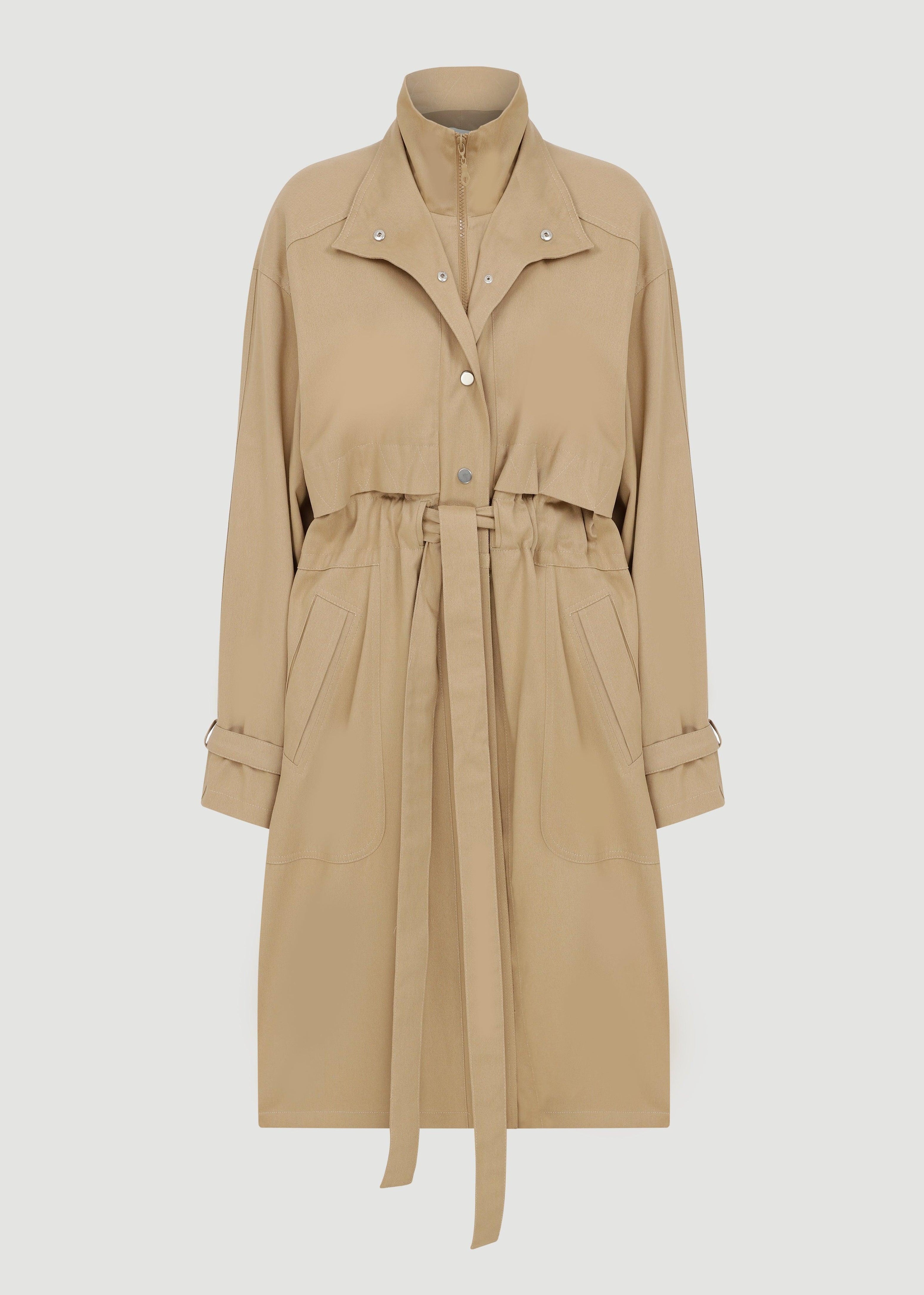 Oversize cut, double collar, inside zipper, outside snap closure, sleeves and waist trench coat with belt detail.