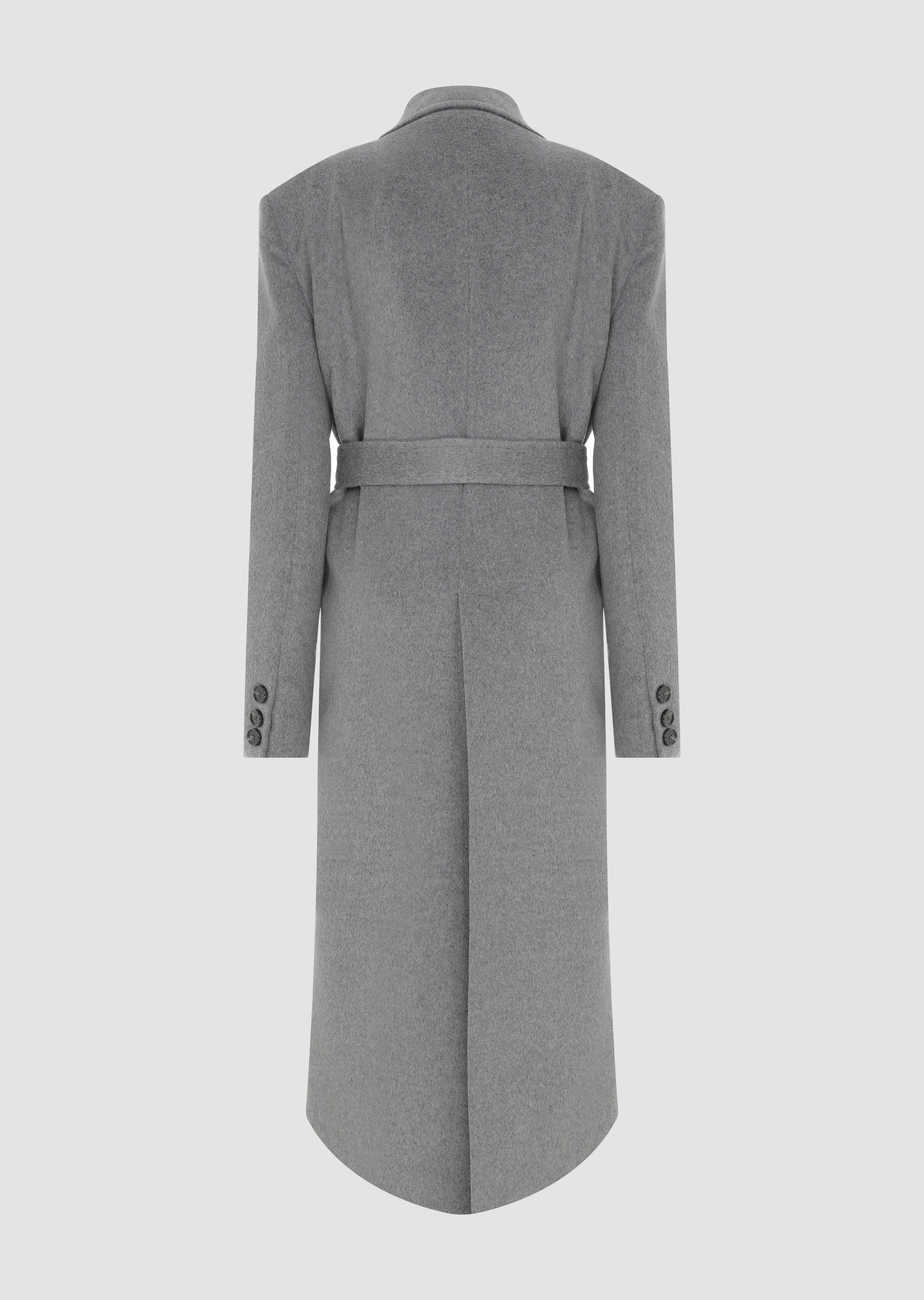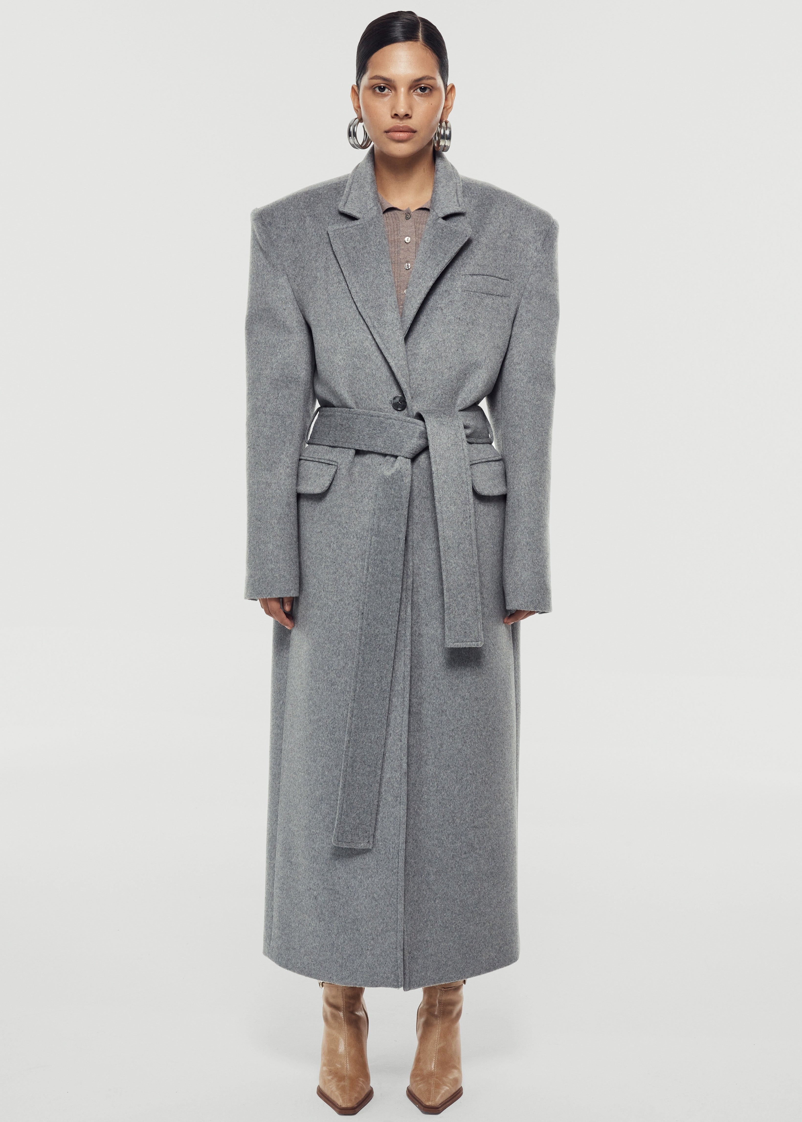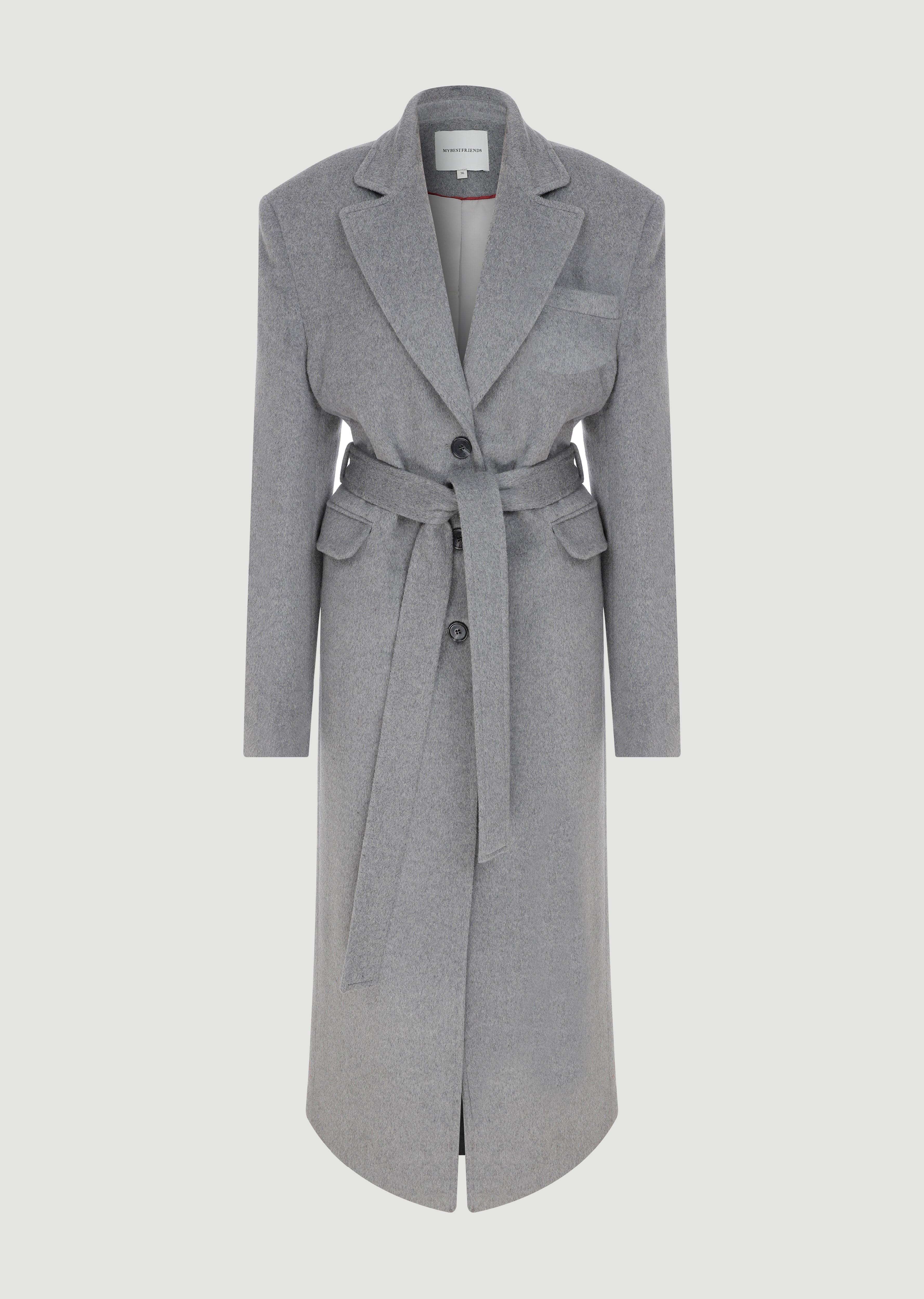 Long wool coat that can be tied at the waist.