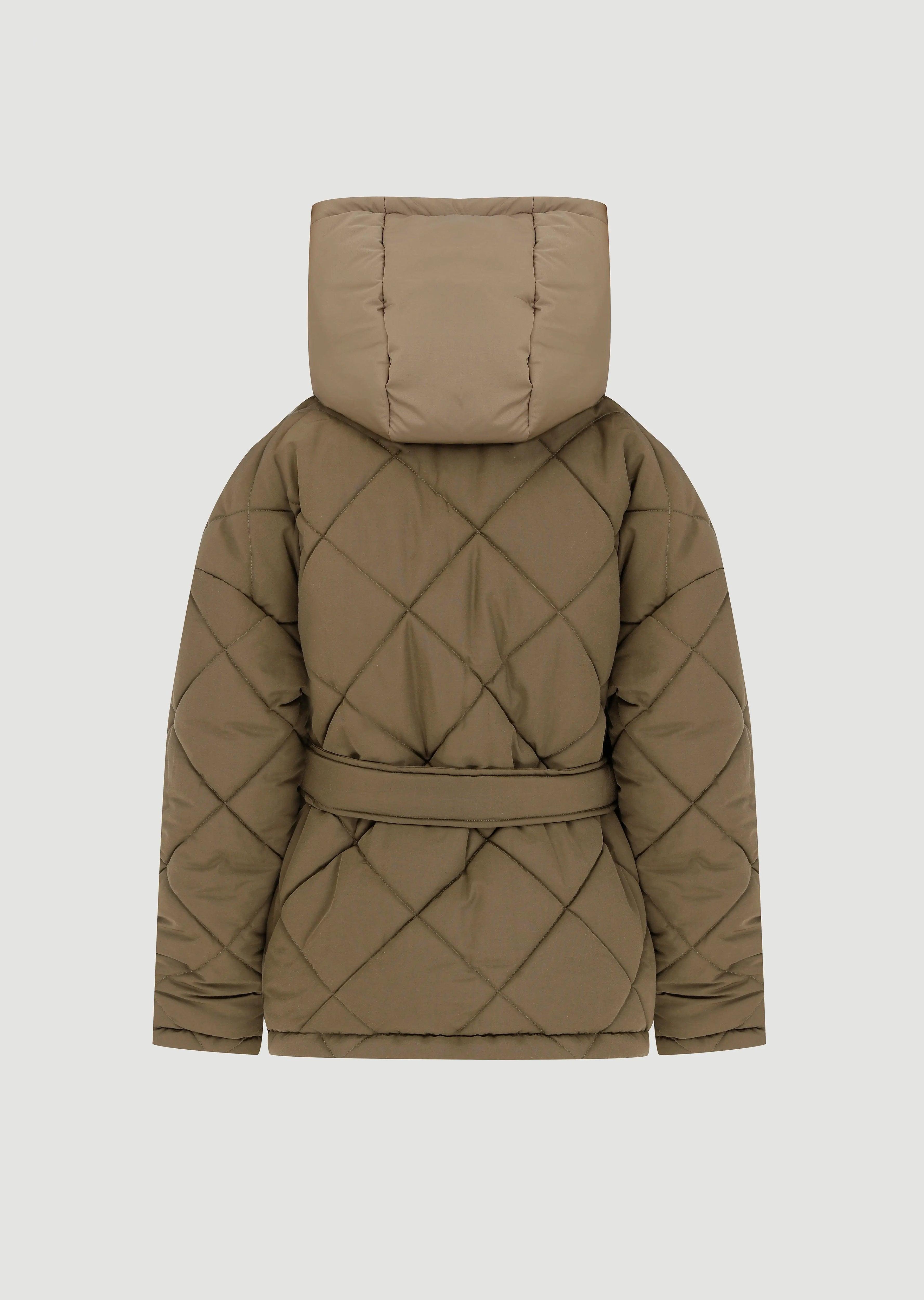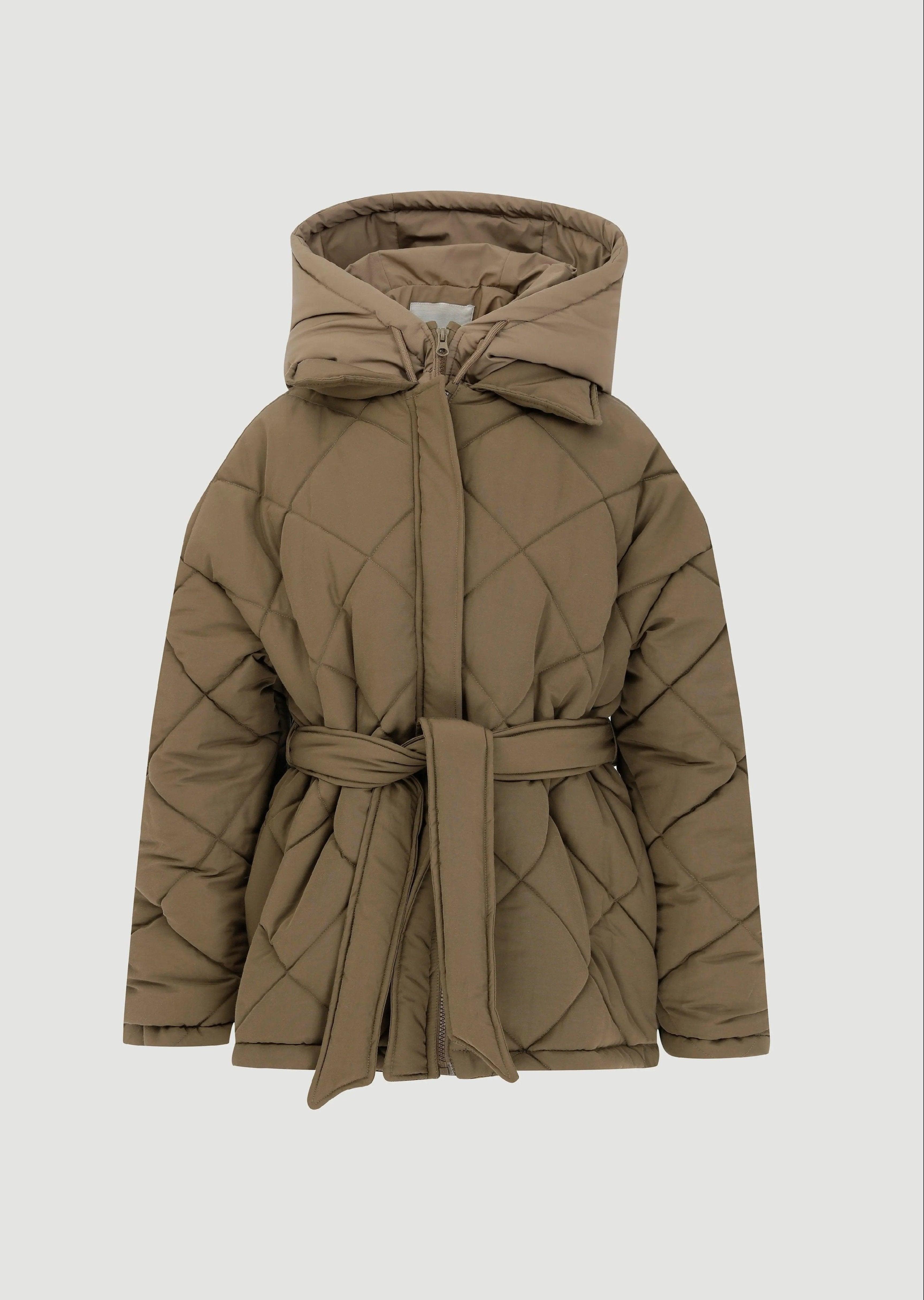 Oversized, padded coat with waist tie, hood and double zipper on the front.