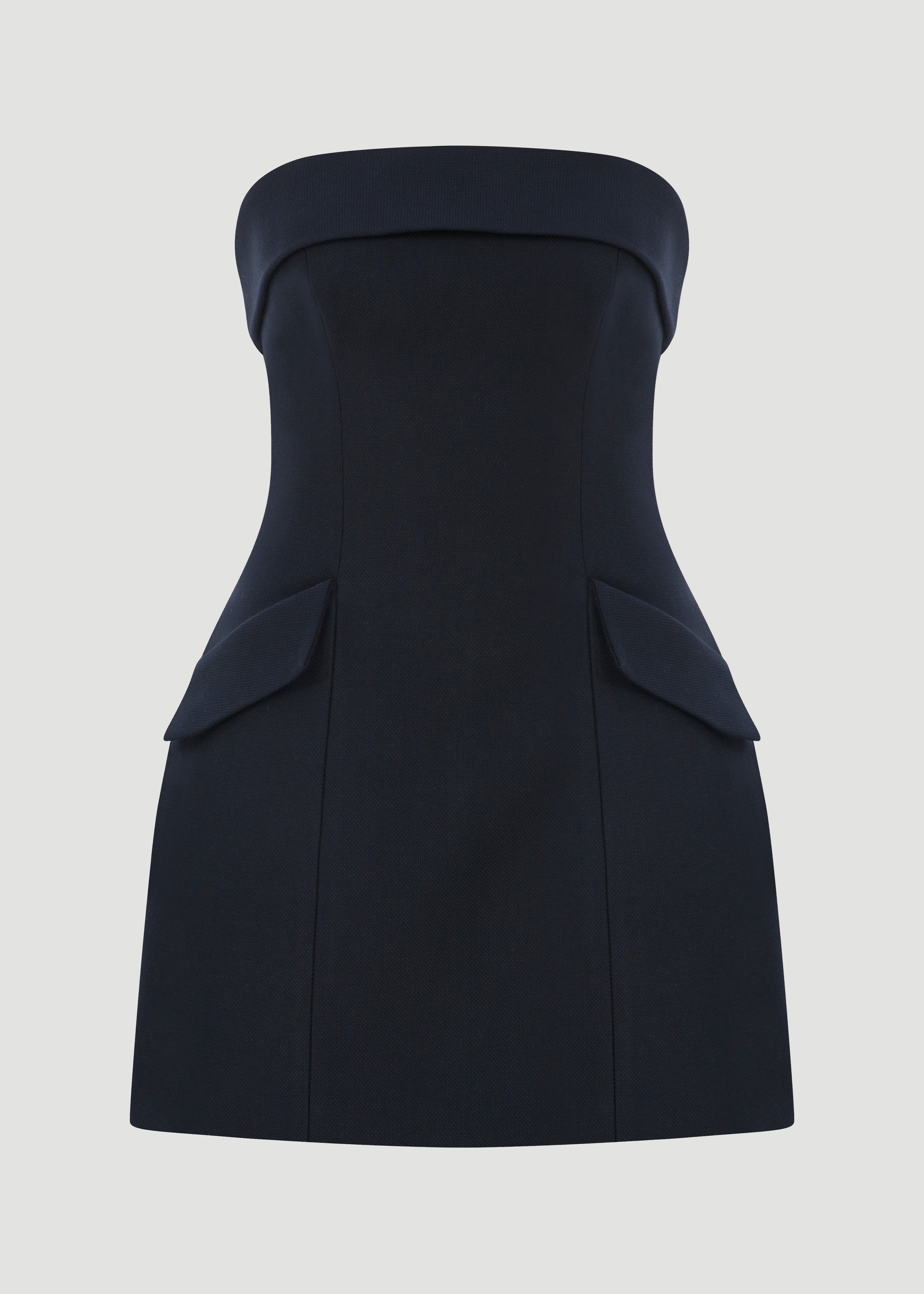 Pocket detailed, strapless, mini dress.