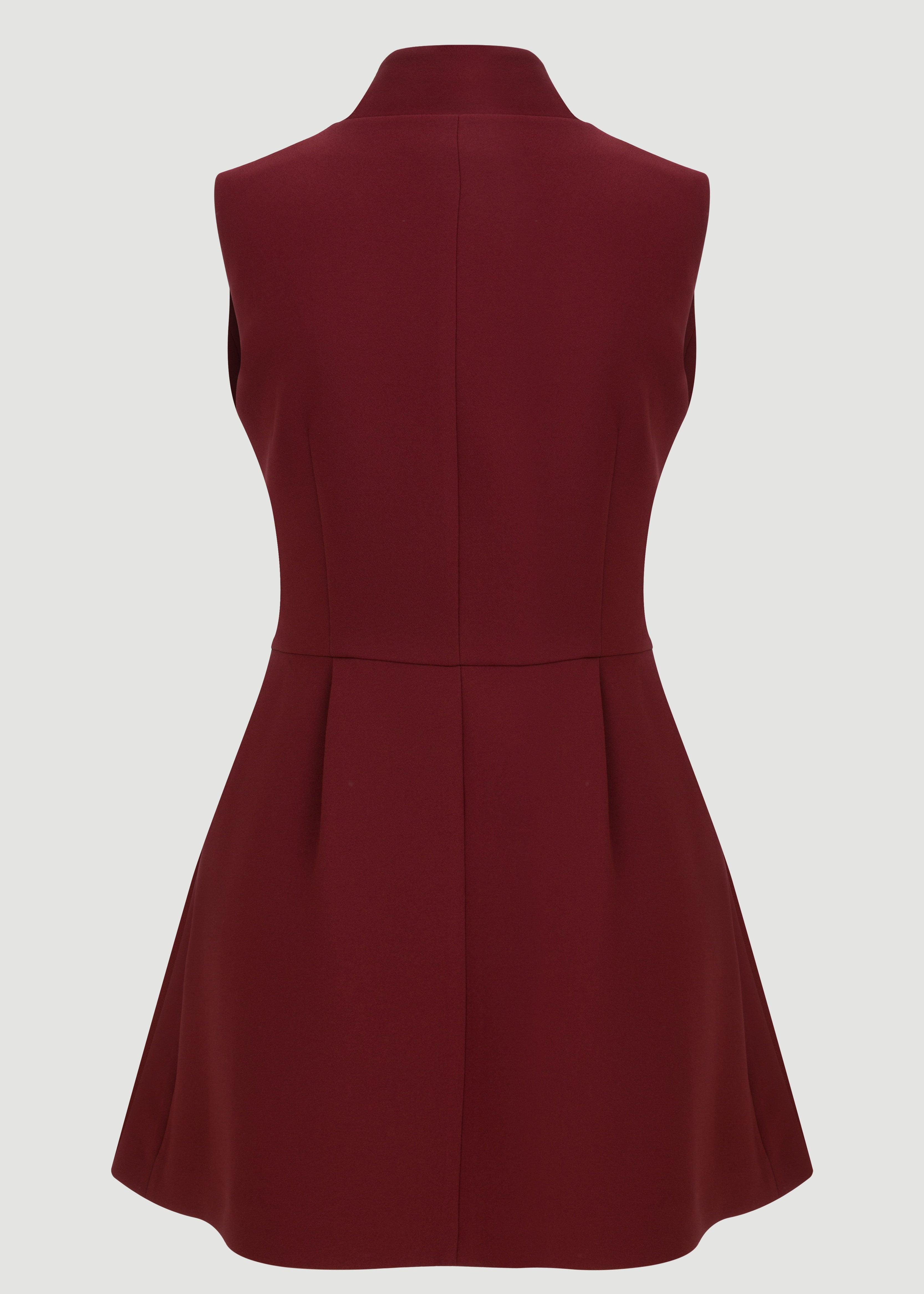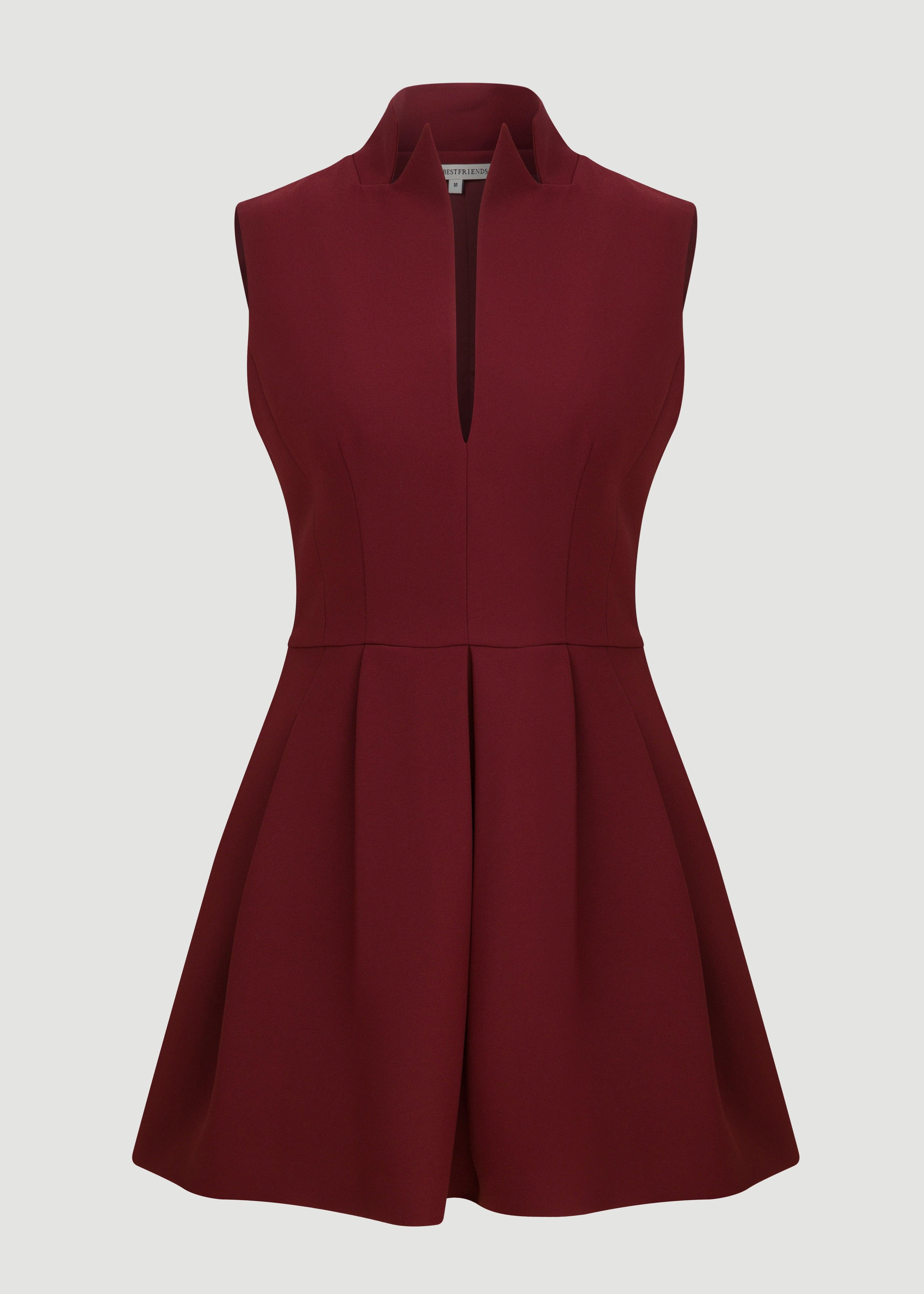 Mini dress with a high neckline, long sleeves and pleated details.