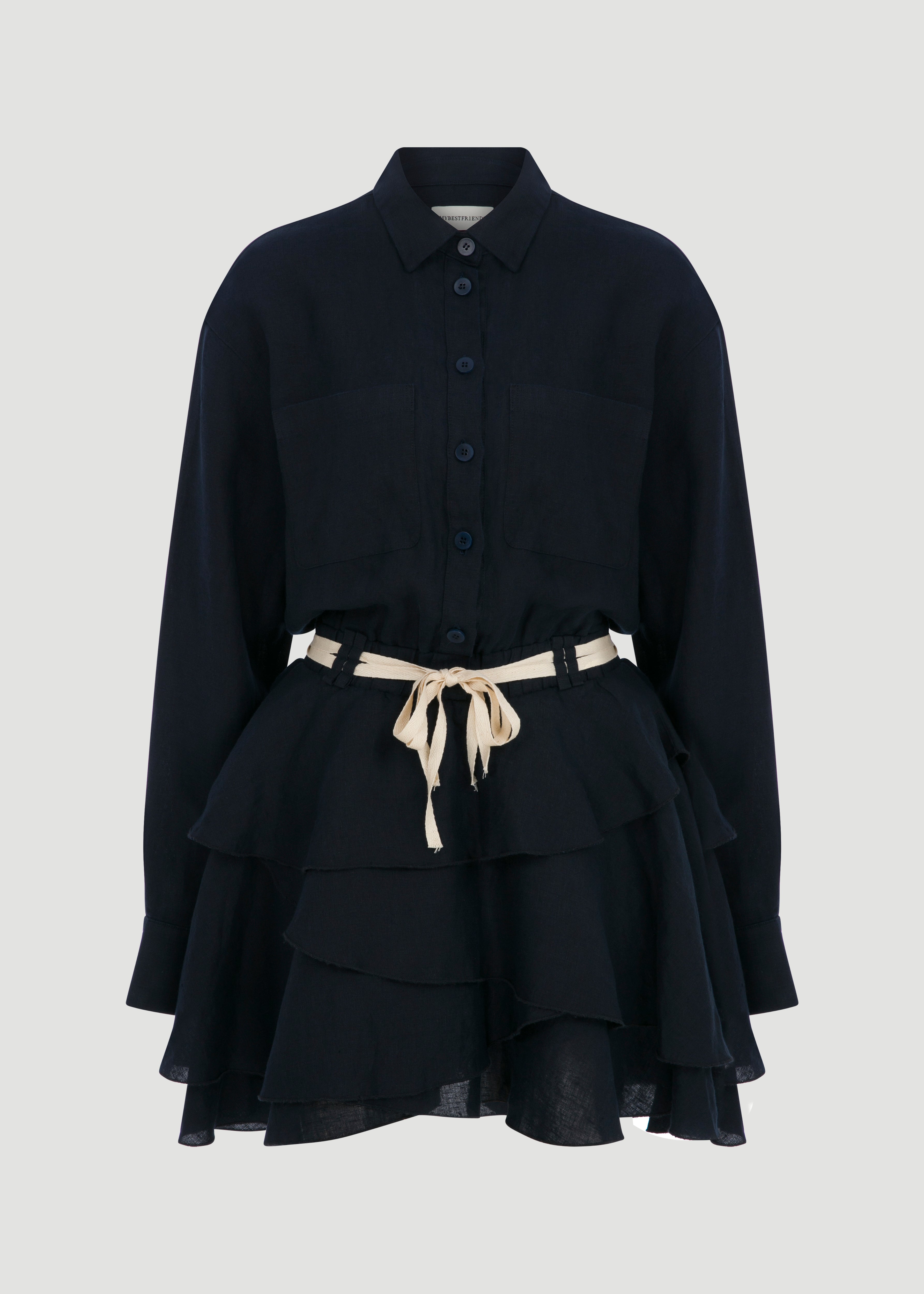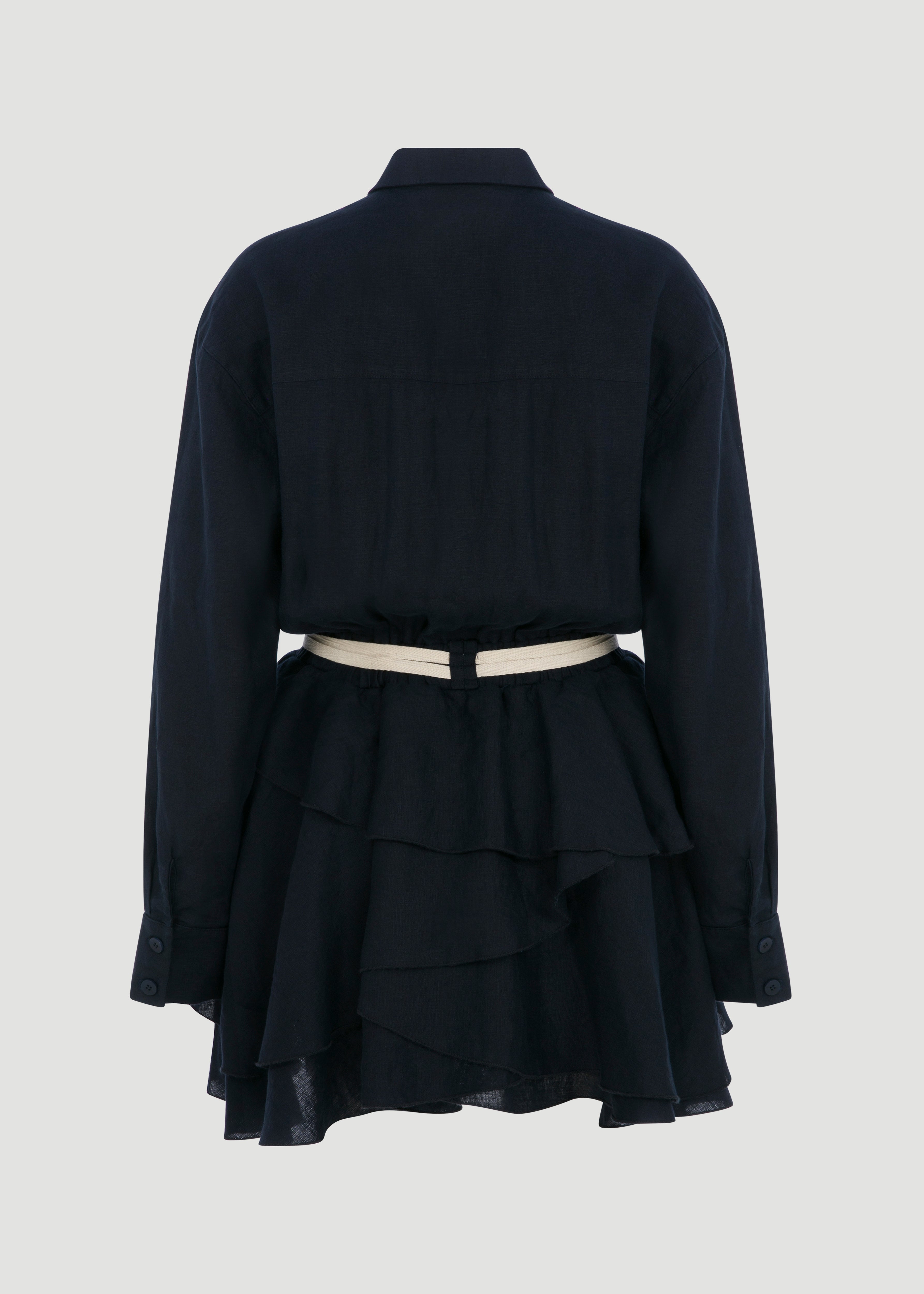 Mini shirt dress with flounced hem, rope belt detail, long sleeves, and buttons.
