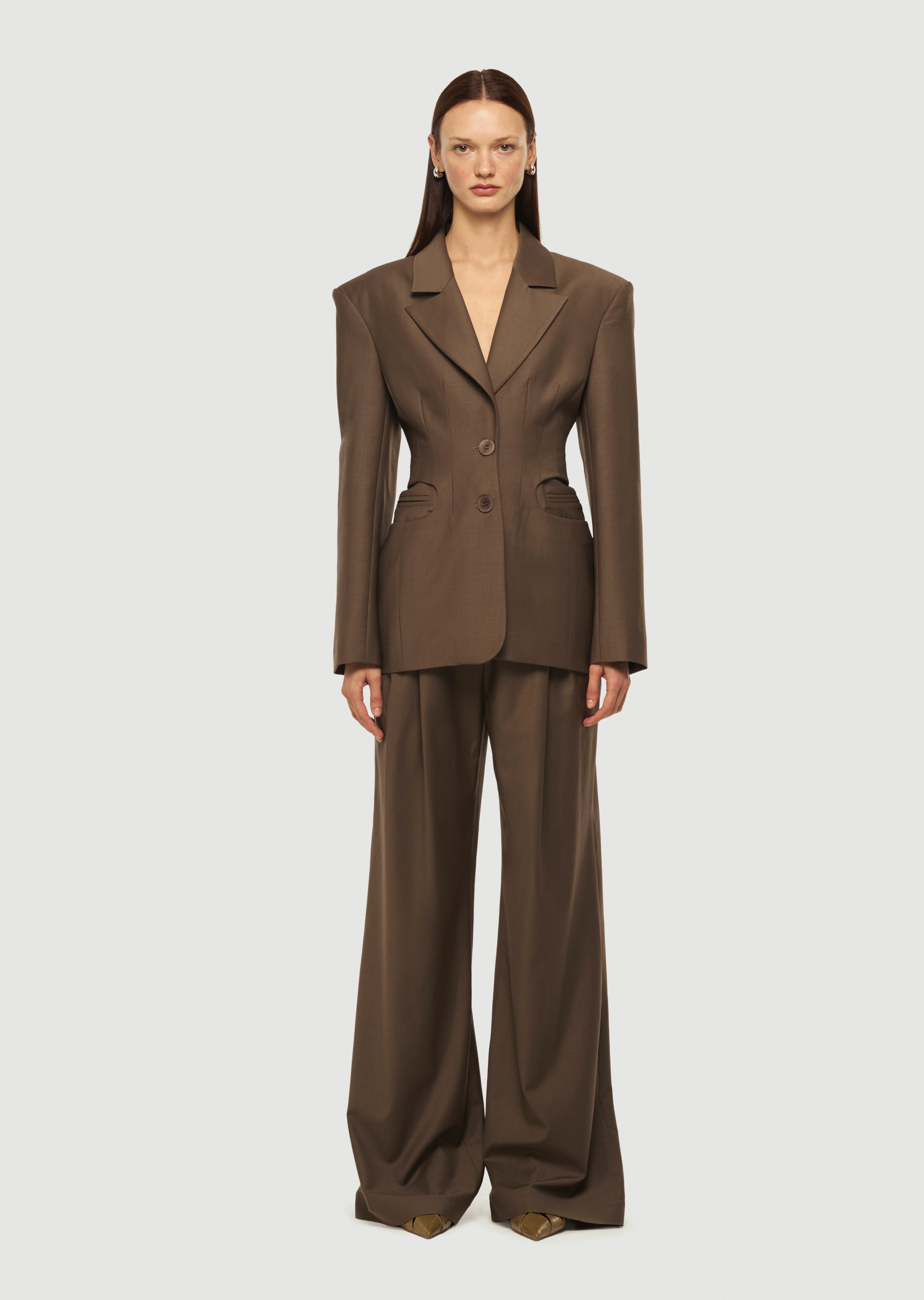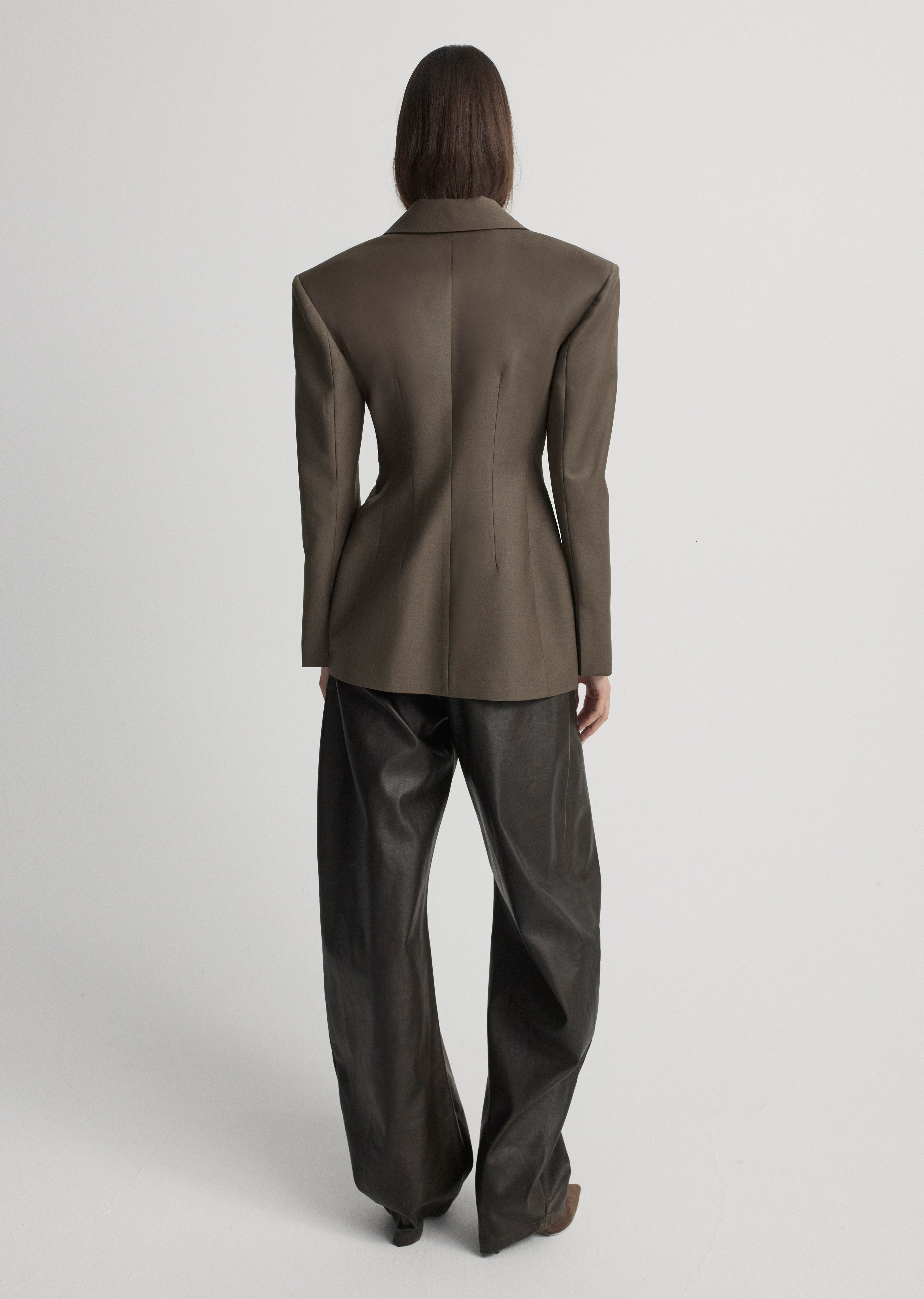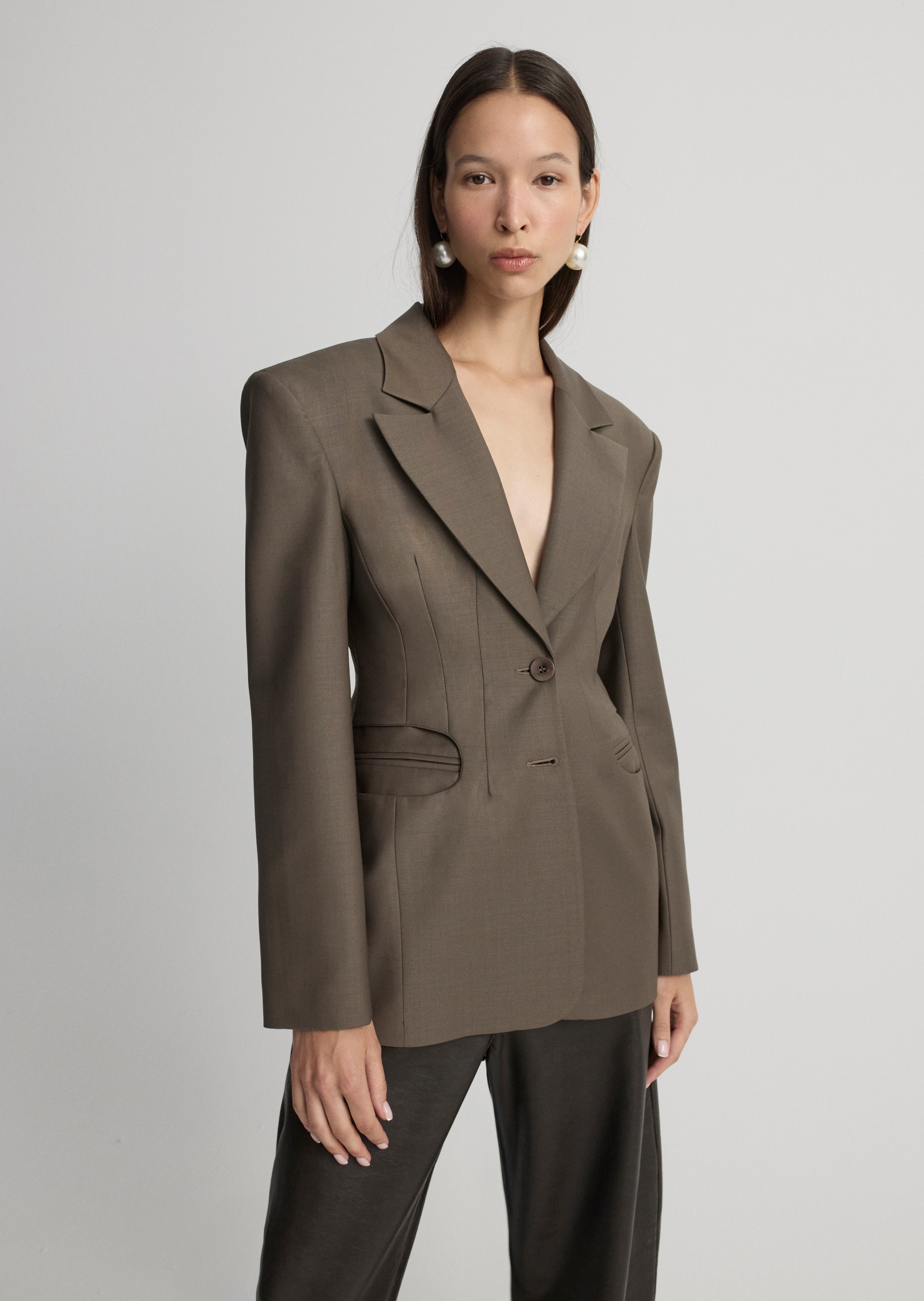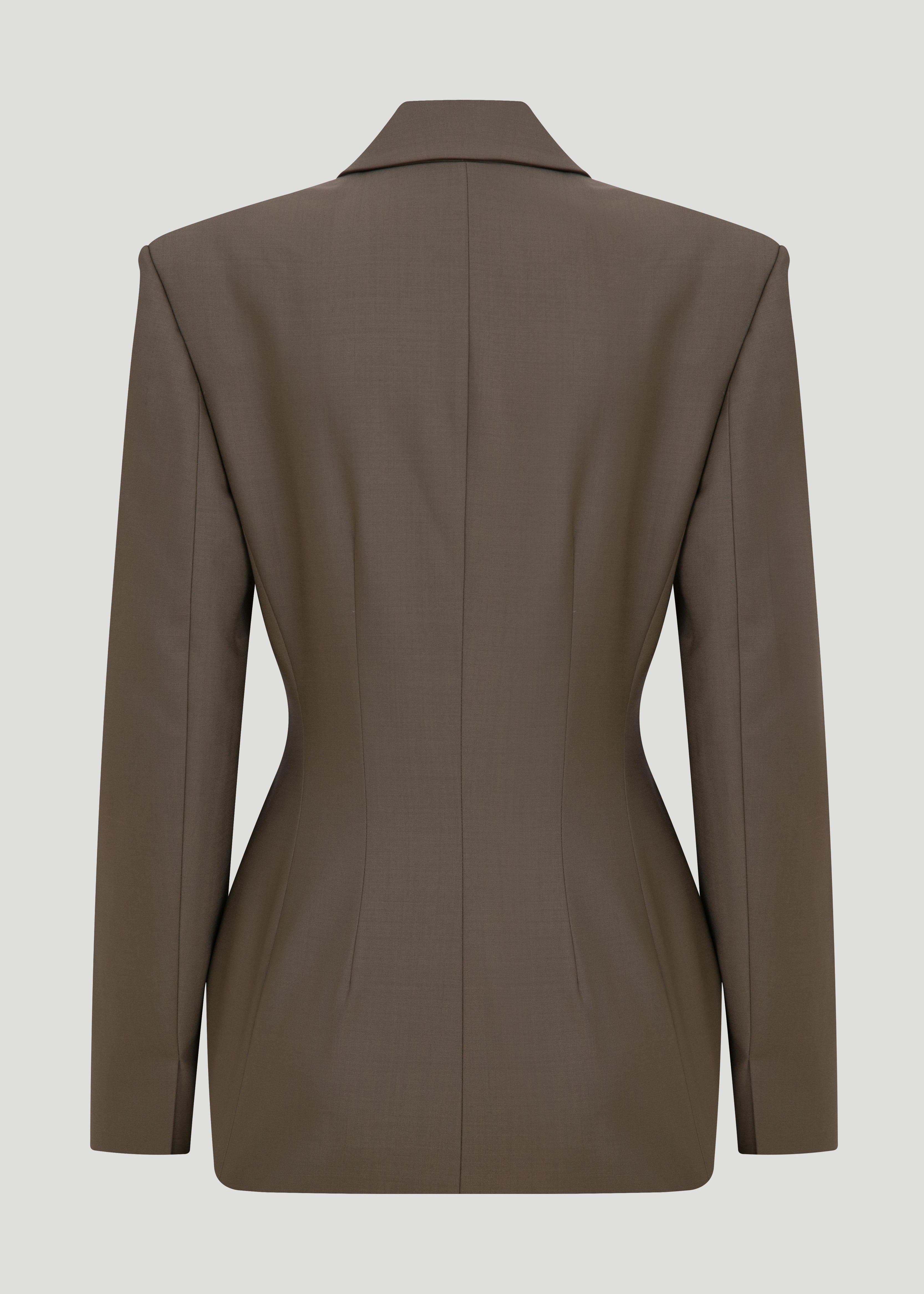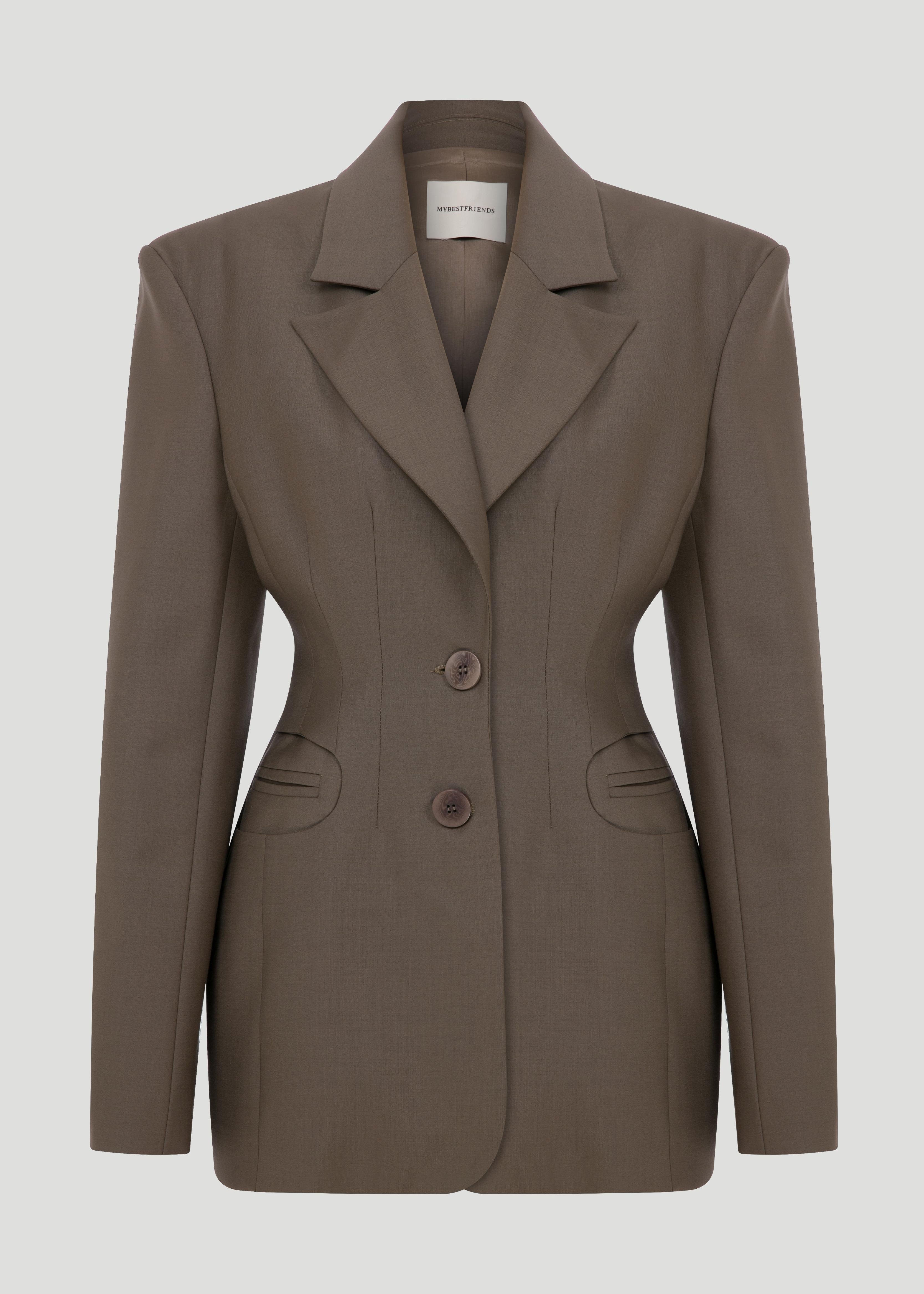 Blazer jacket with shoulder pads, fitting at the waist.