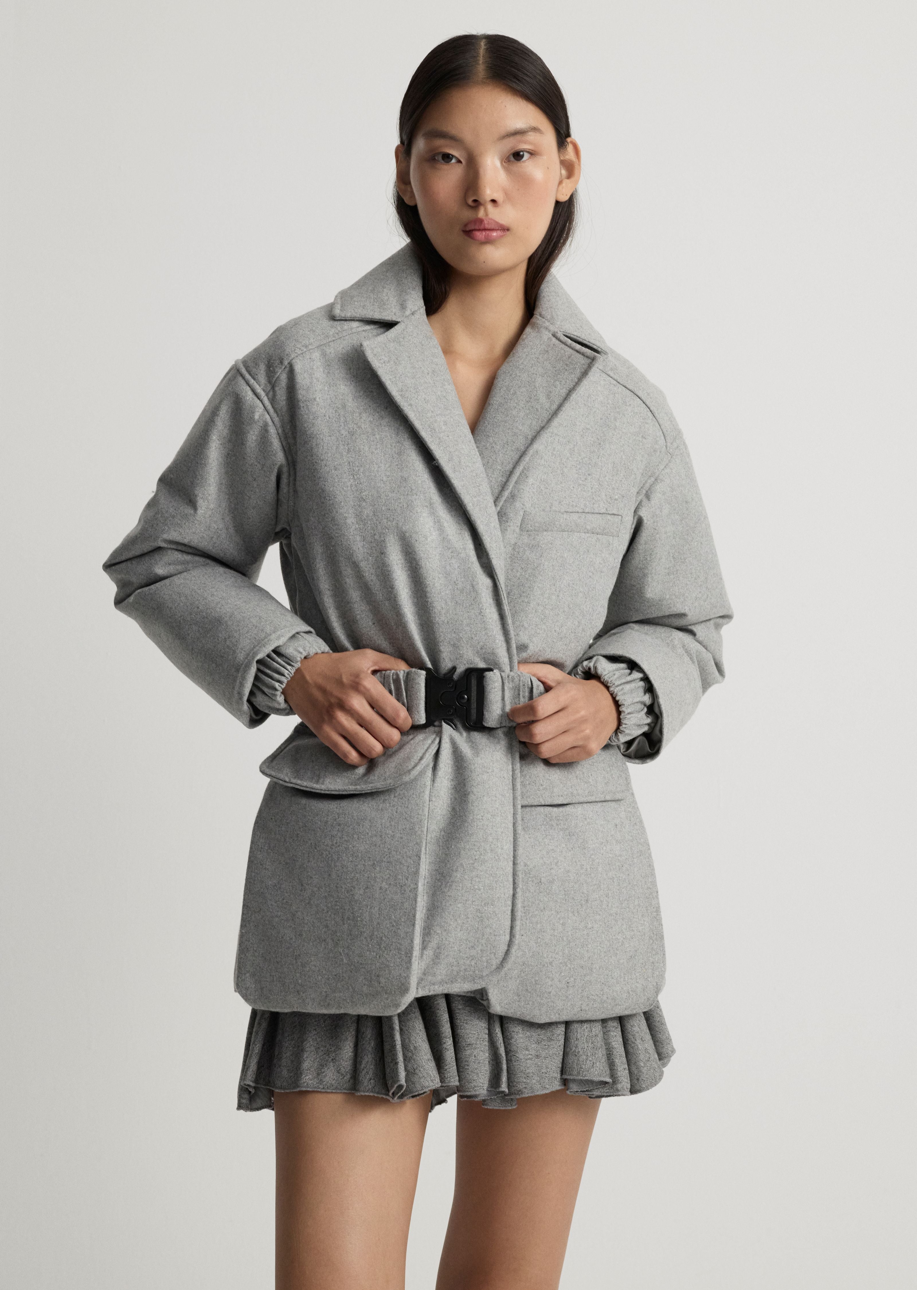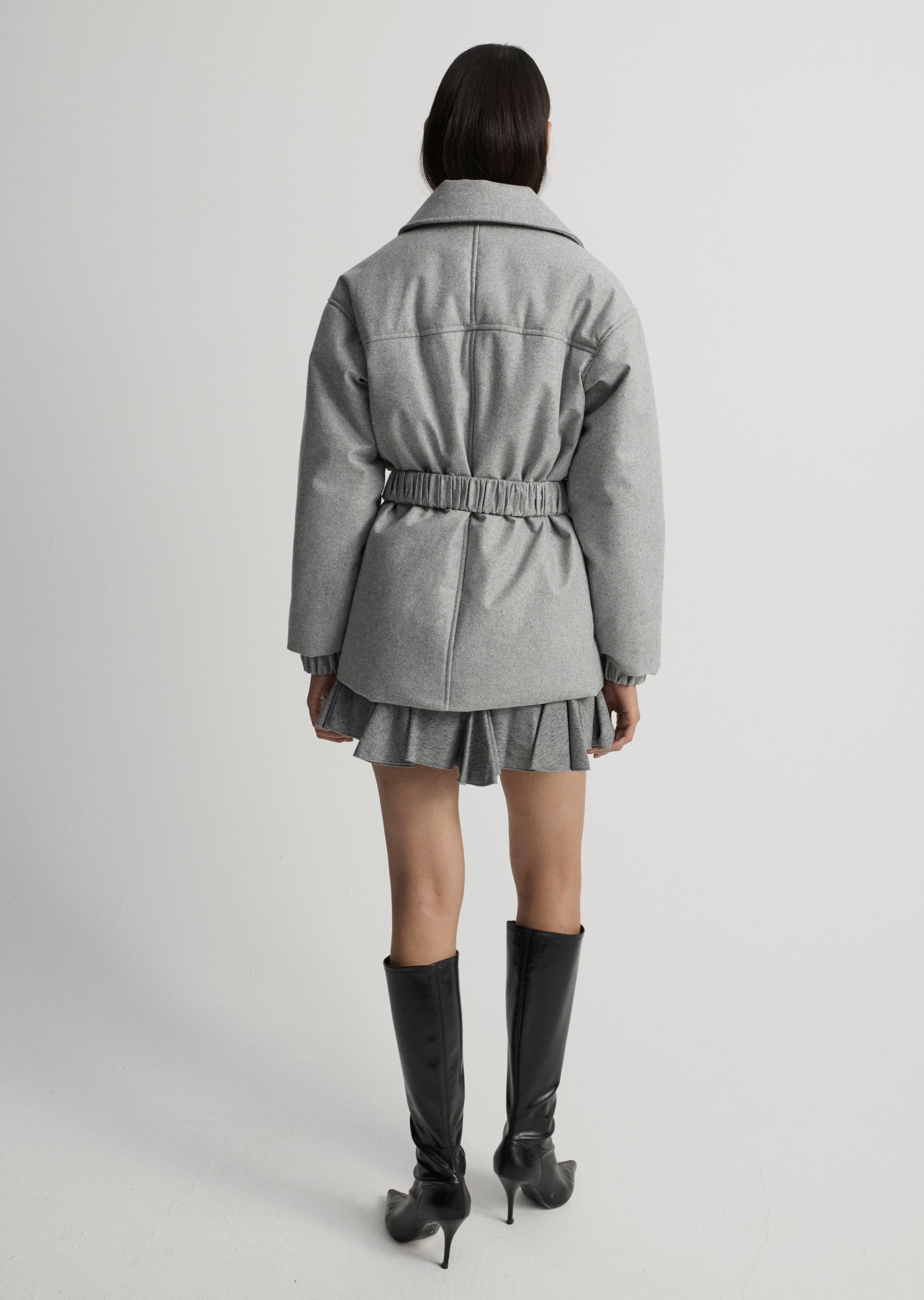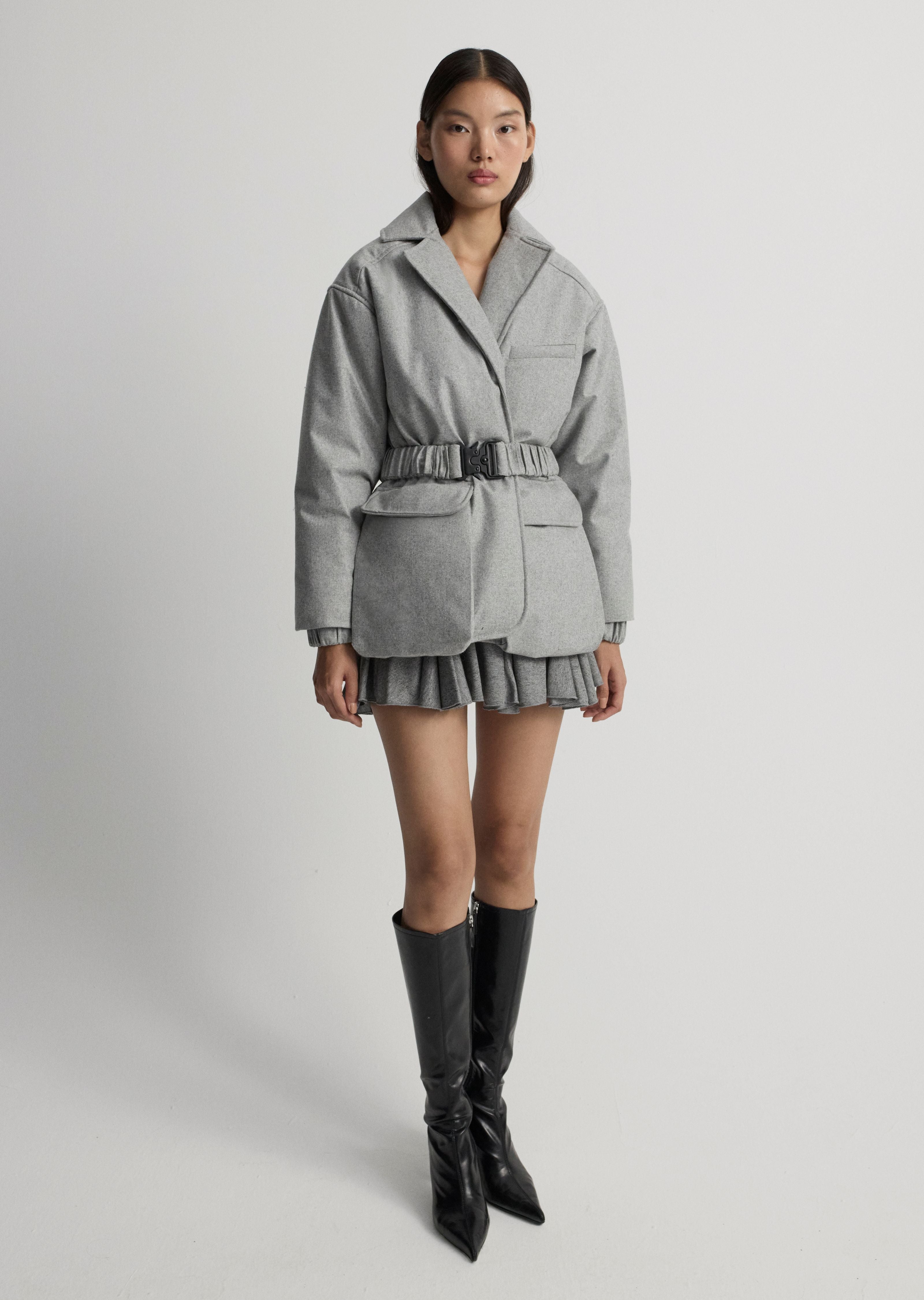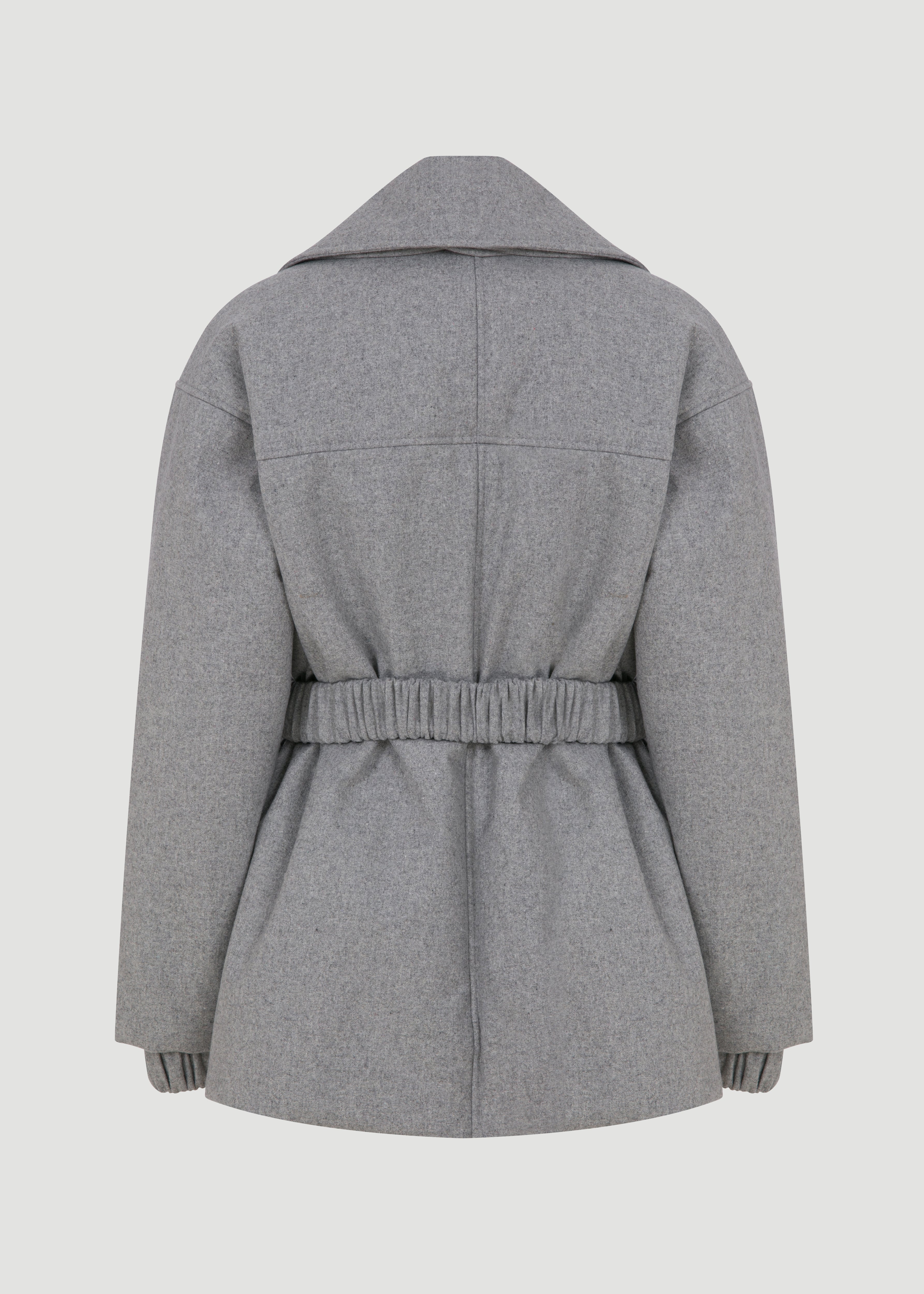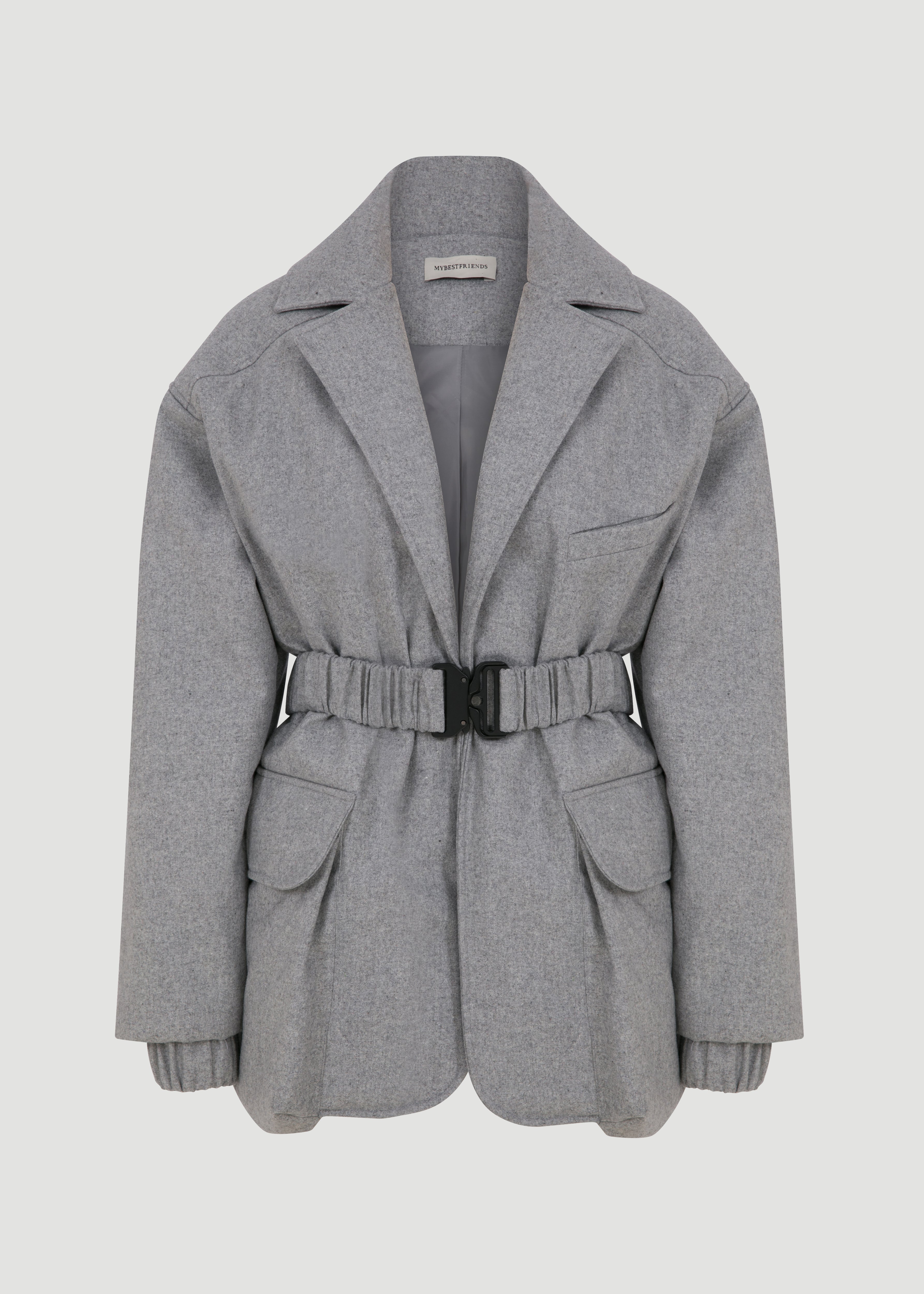 Classic collar, long-sleeved, waist-fitting, elastic belted and buckled, front-zippered, large flap pocket jacket.