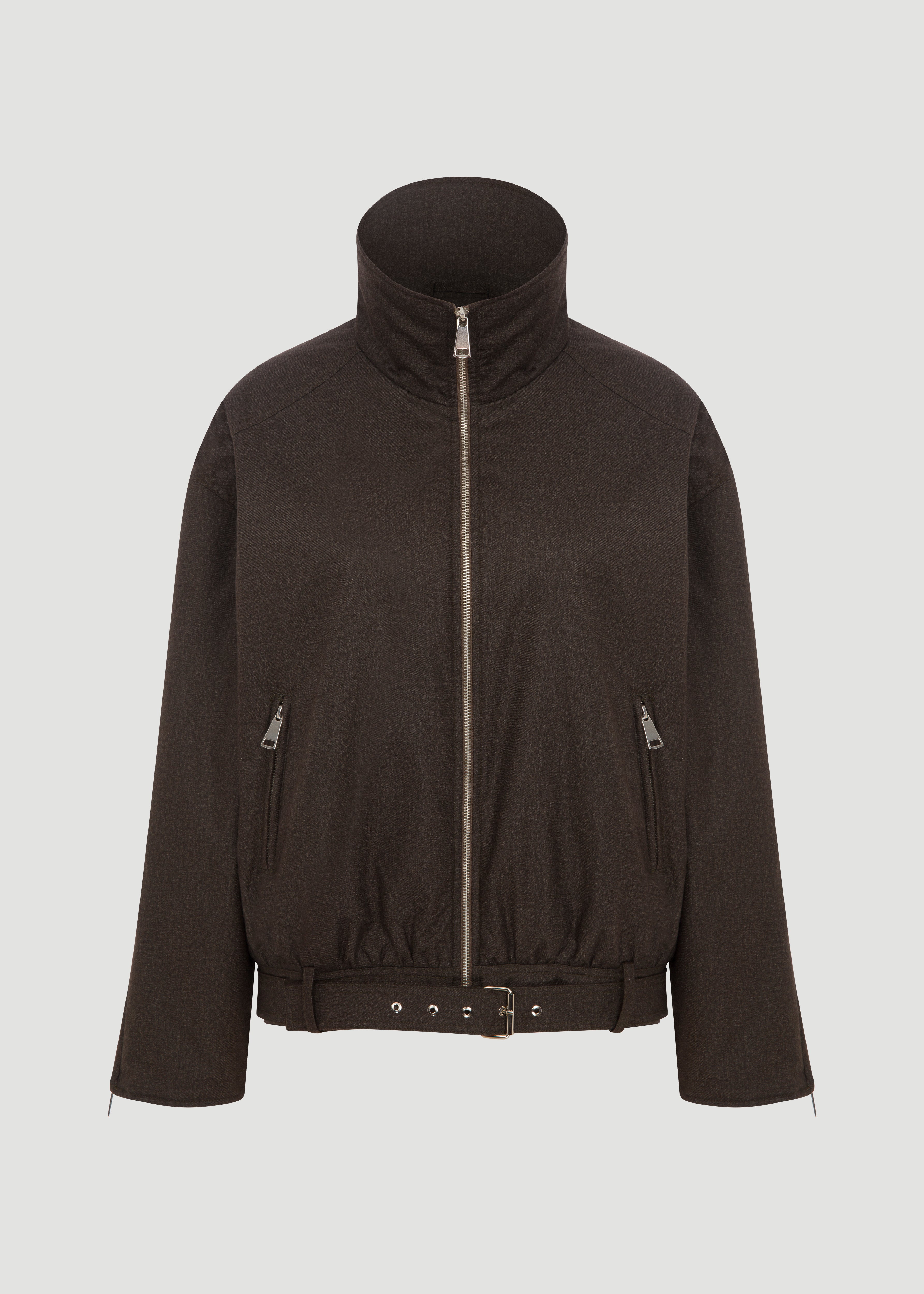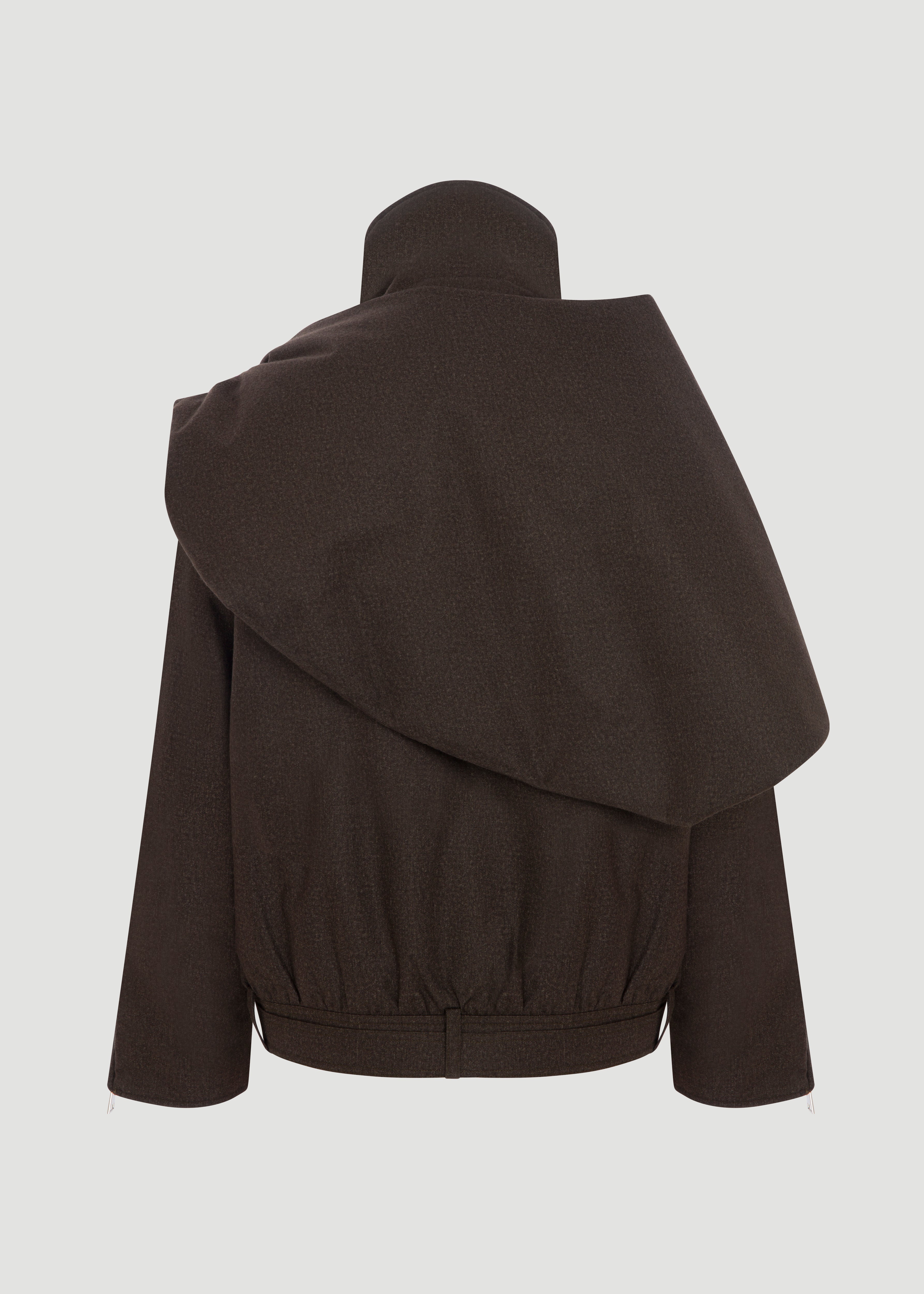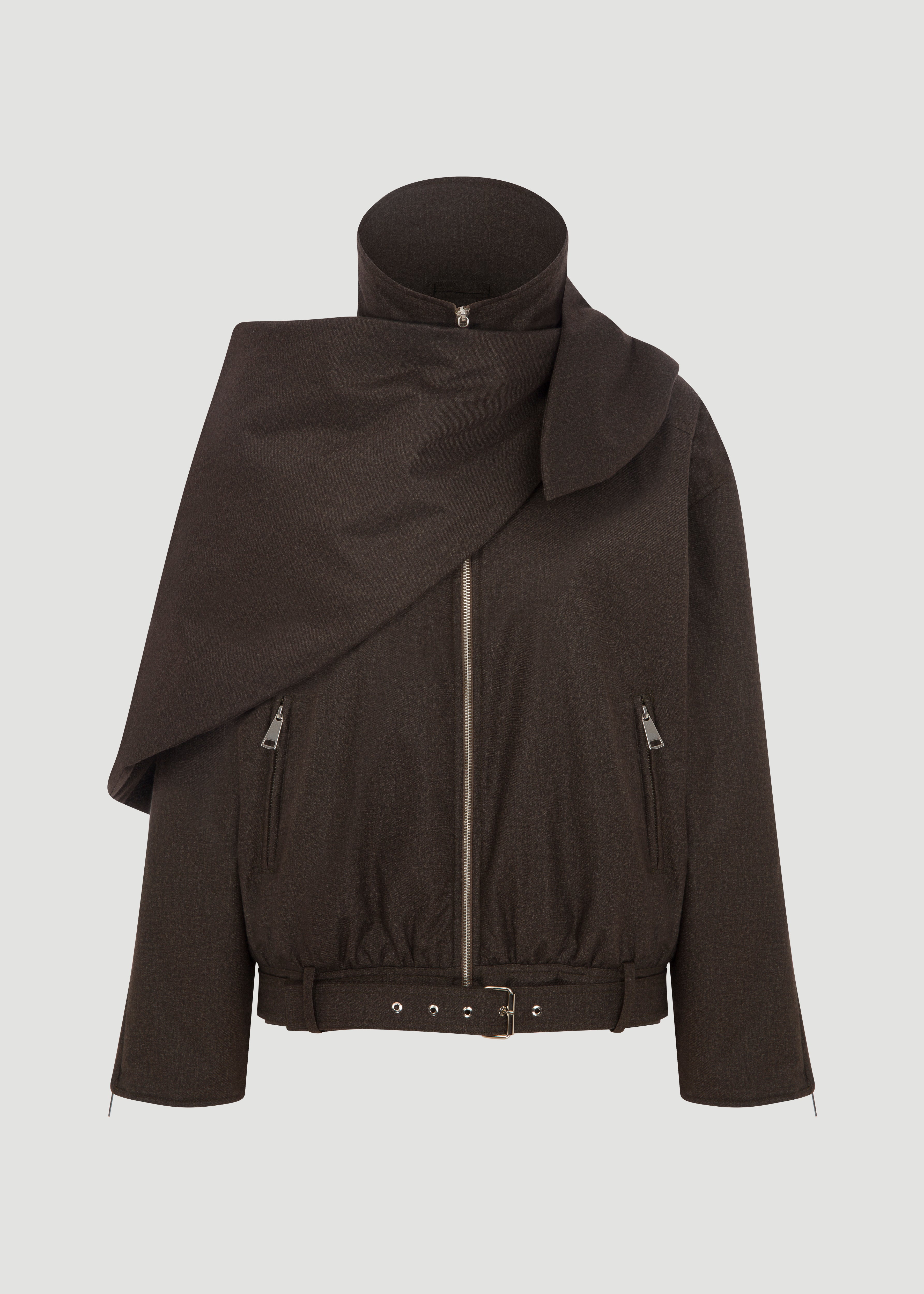 Belted, high-collared, zippered jacket with removable shawl detail.