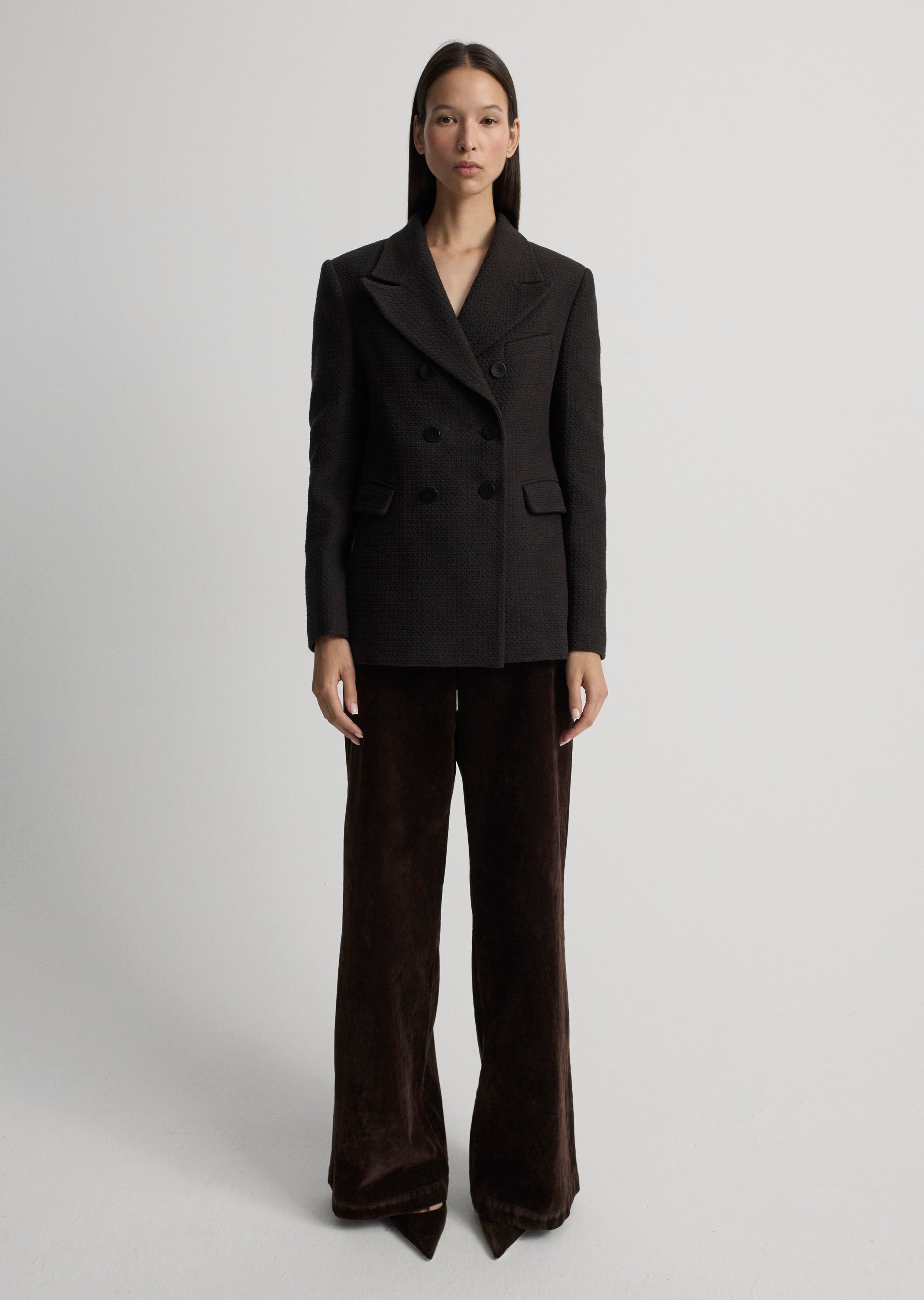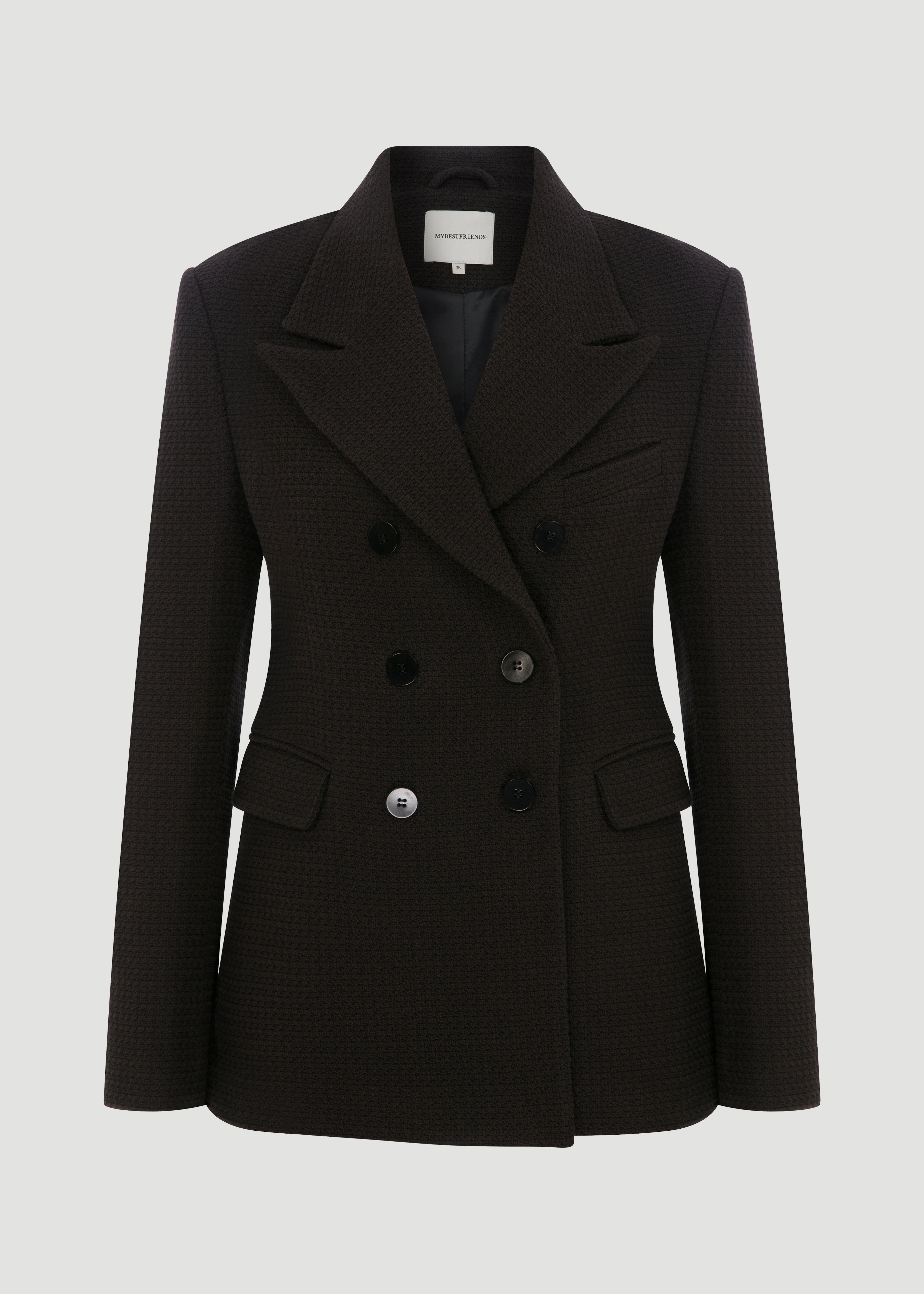 A waist-fitting jacket that stands out with its textured fabric, double-breasted closure and leather button details.