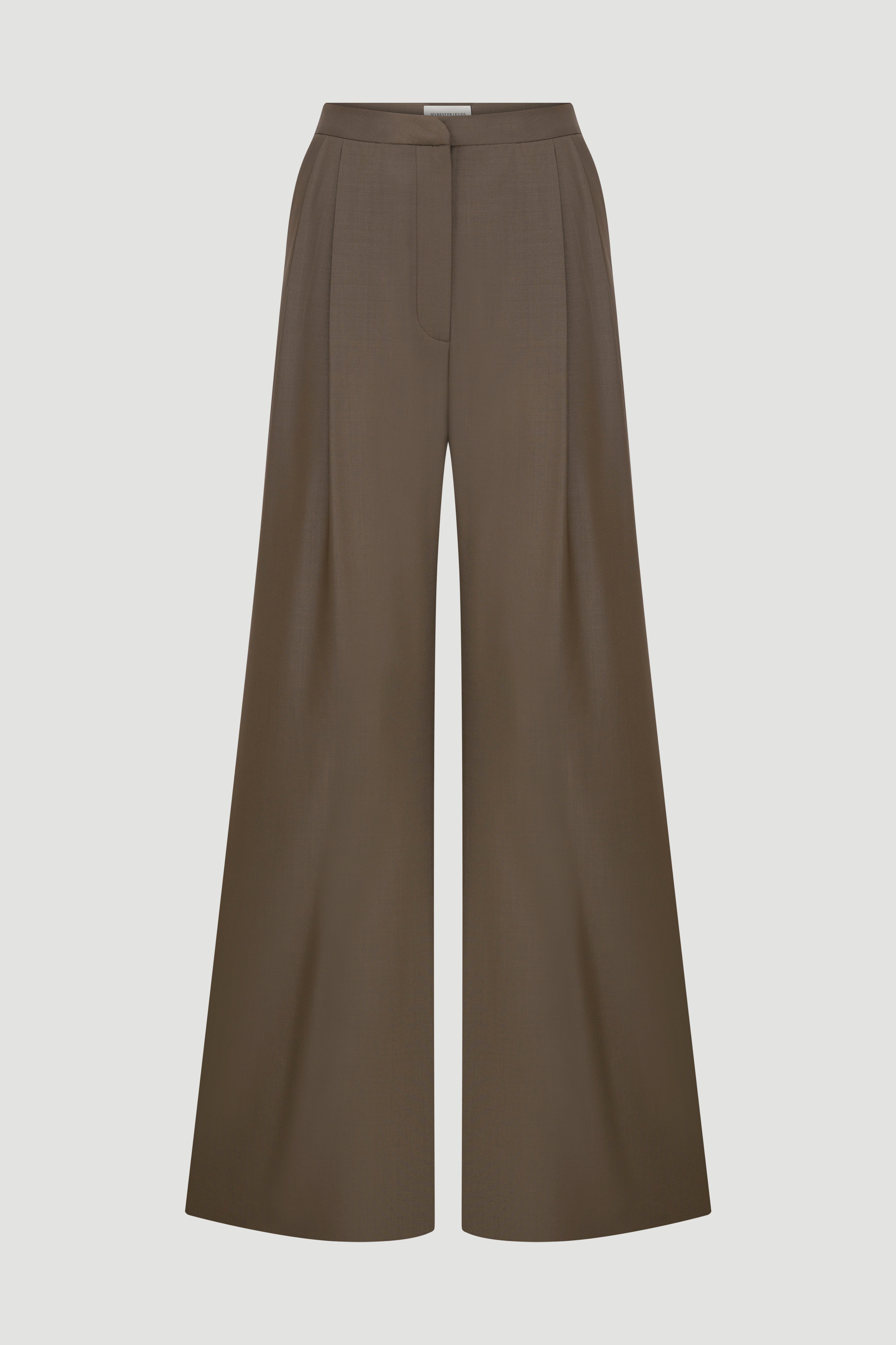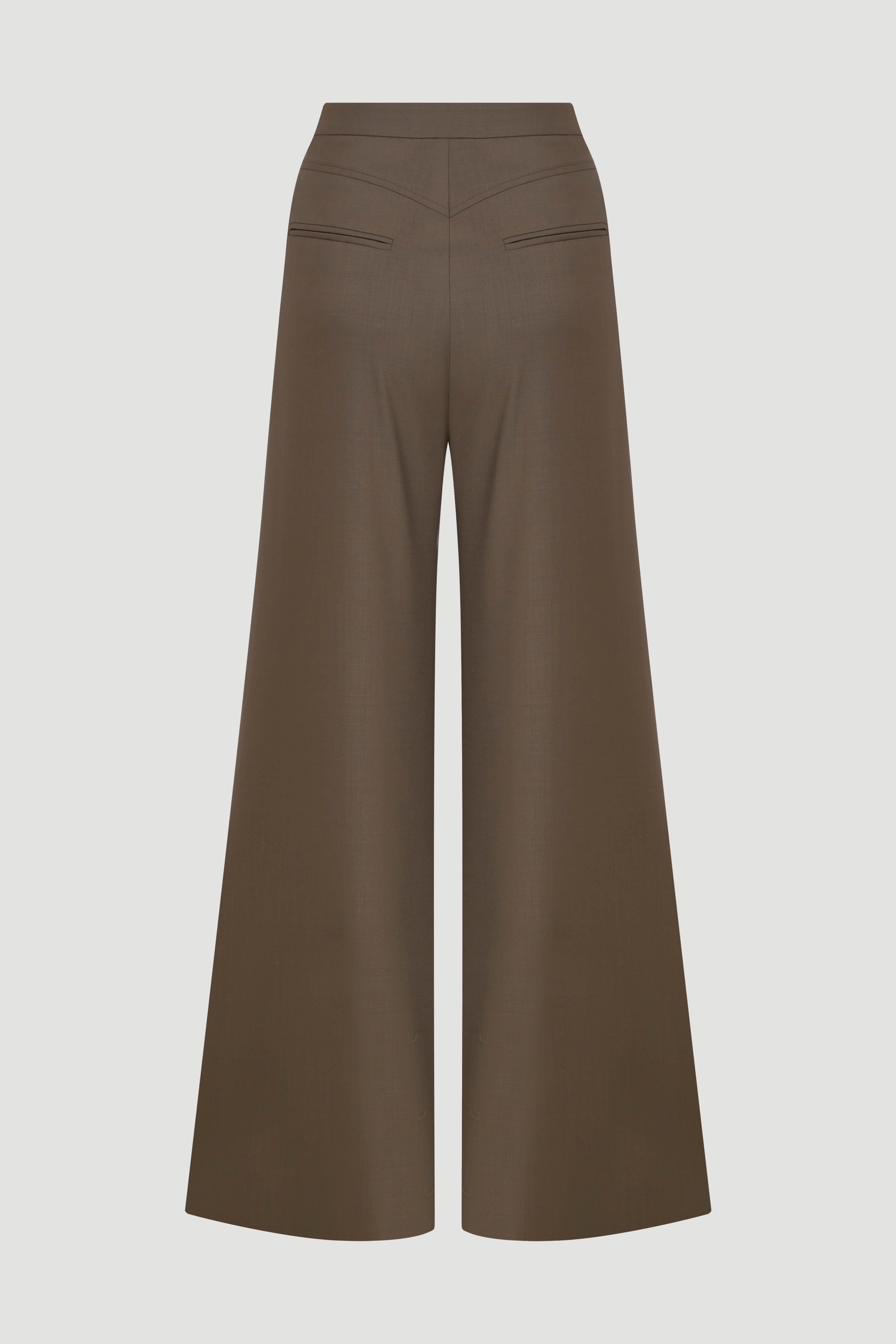 High-waisted, front zipper closure, side pocket, wide-leg pants.