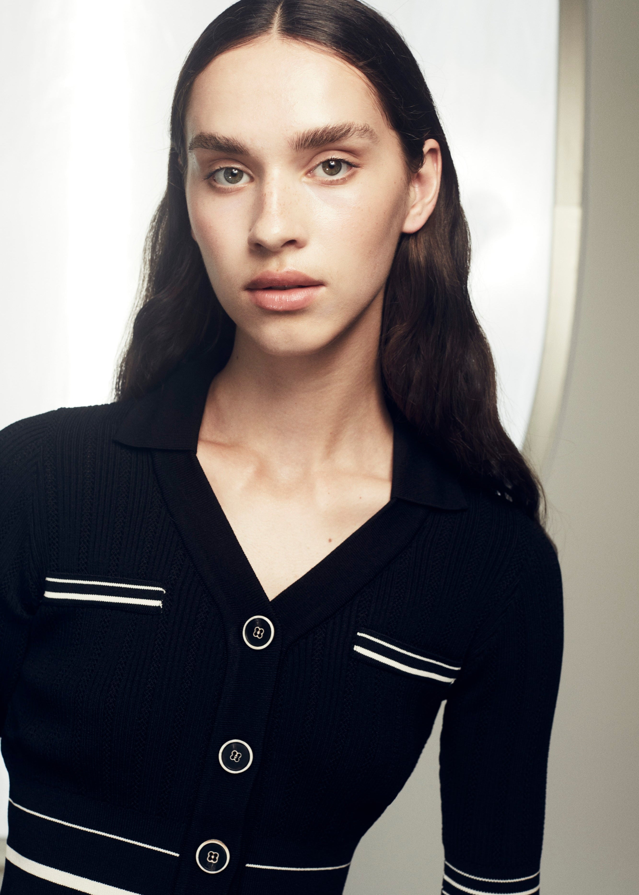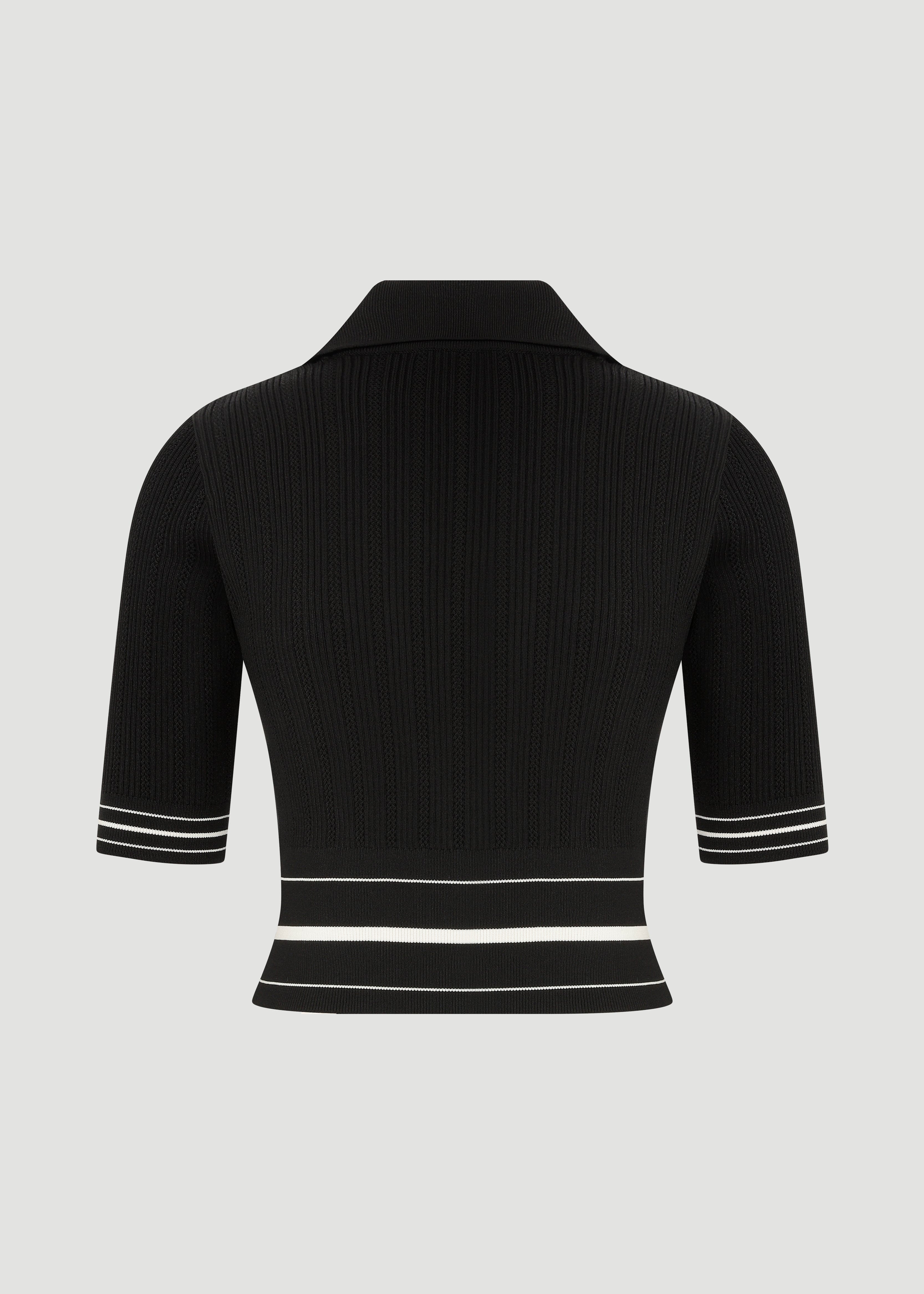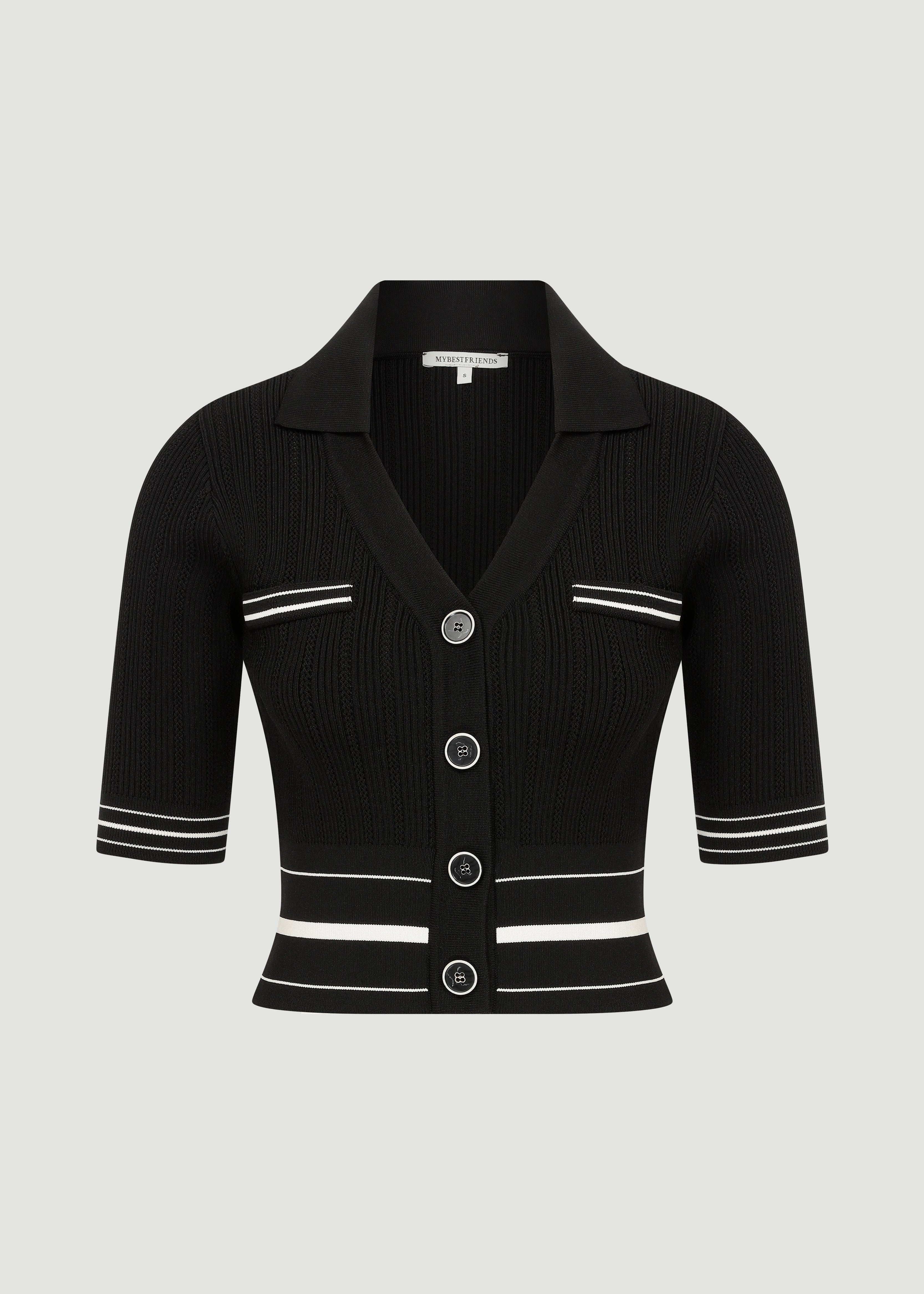 Short sleeve cardigan with contrast stripe detail, collared design.