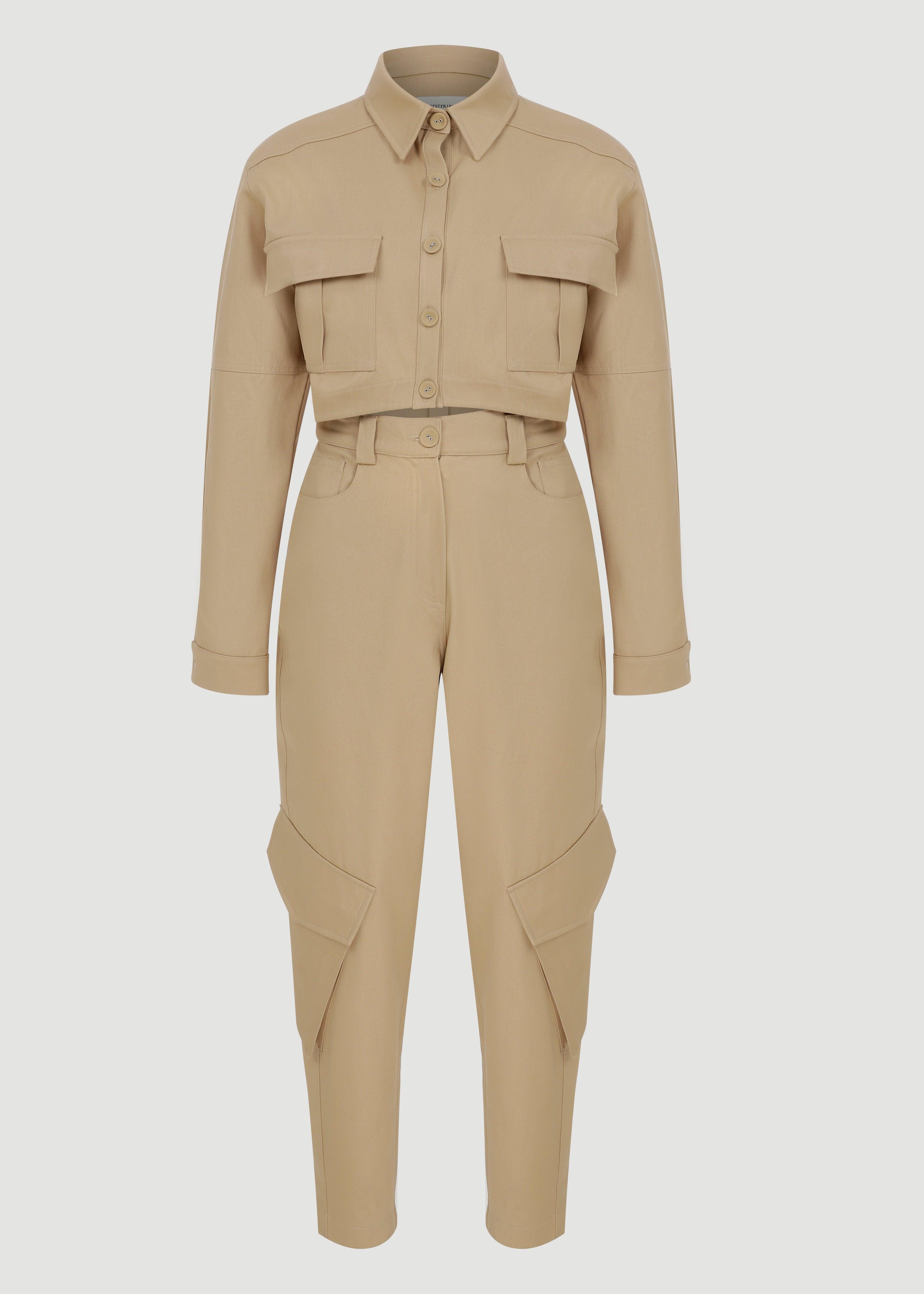 Long-sleeved, carrot-cut overalls with pocket and cut-out details.