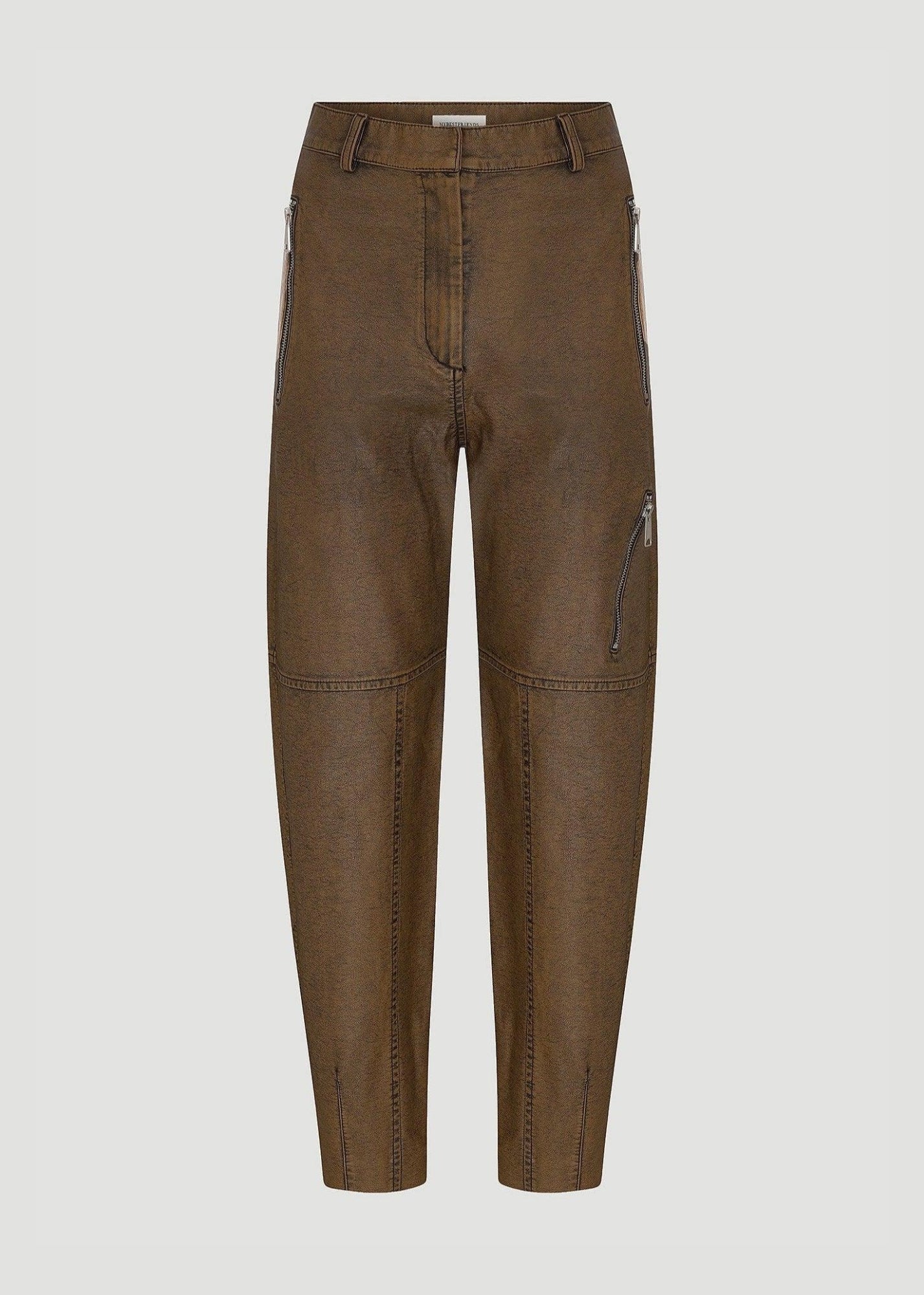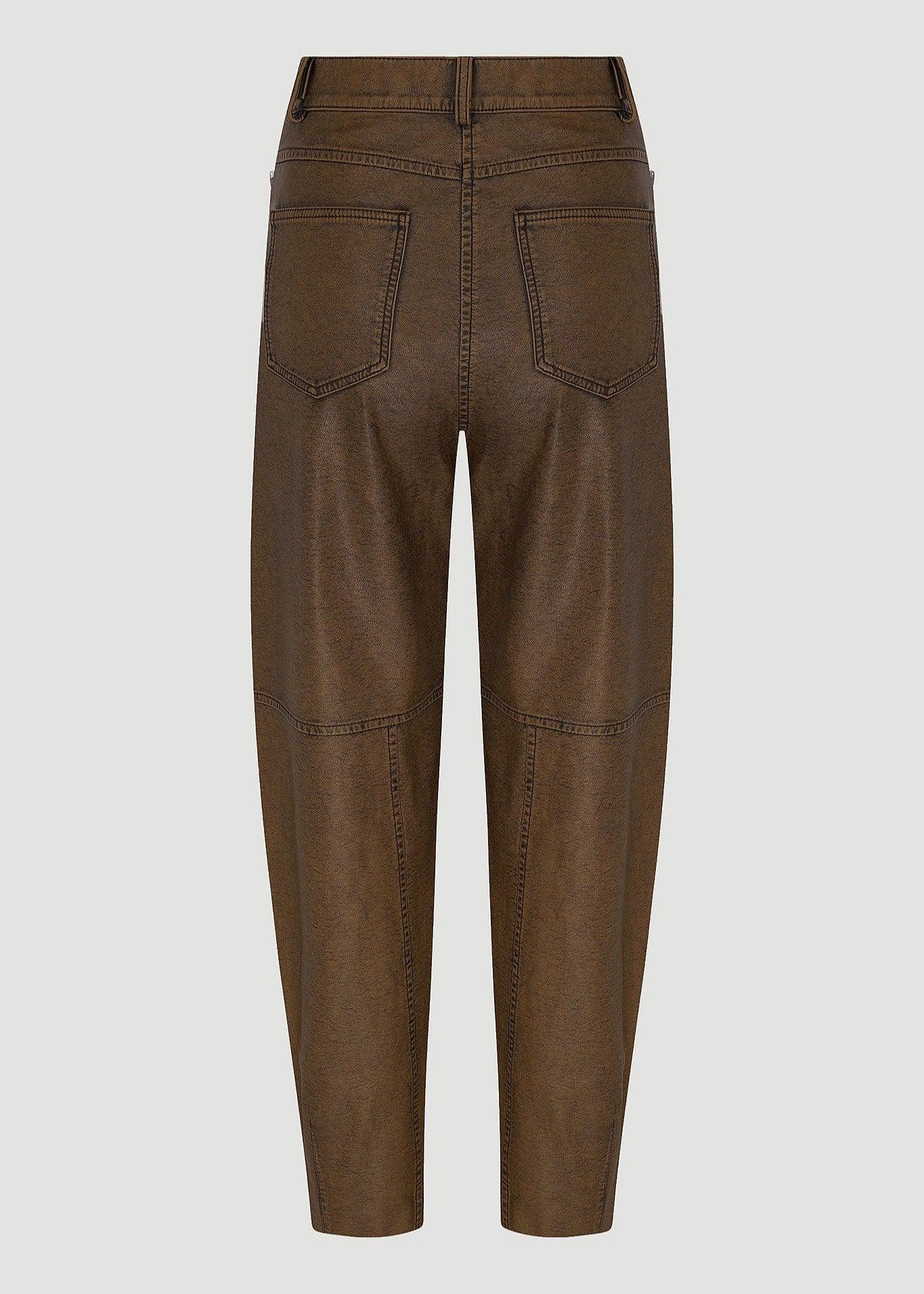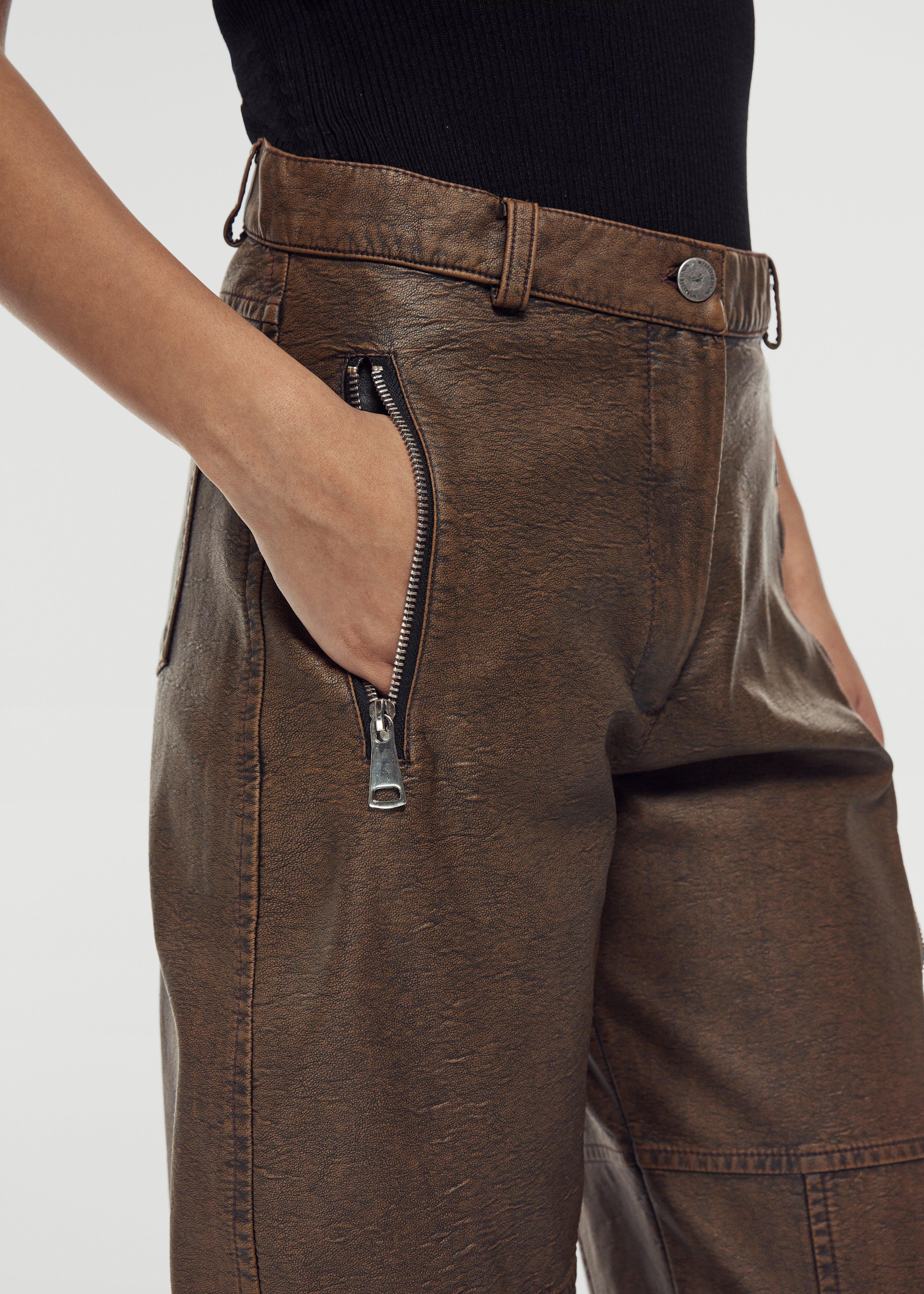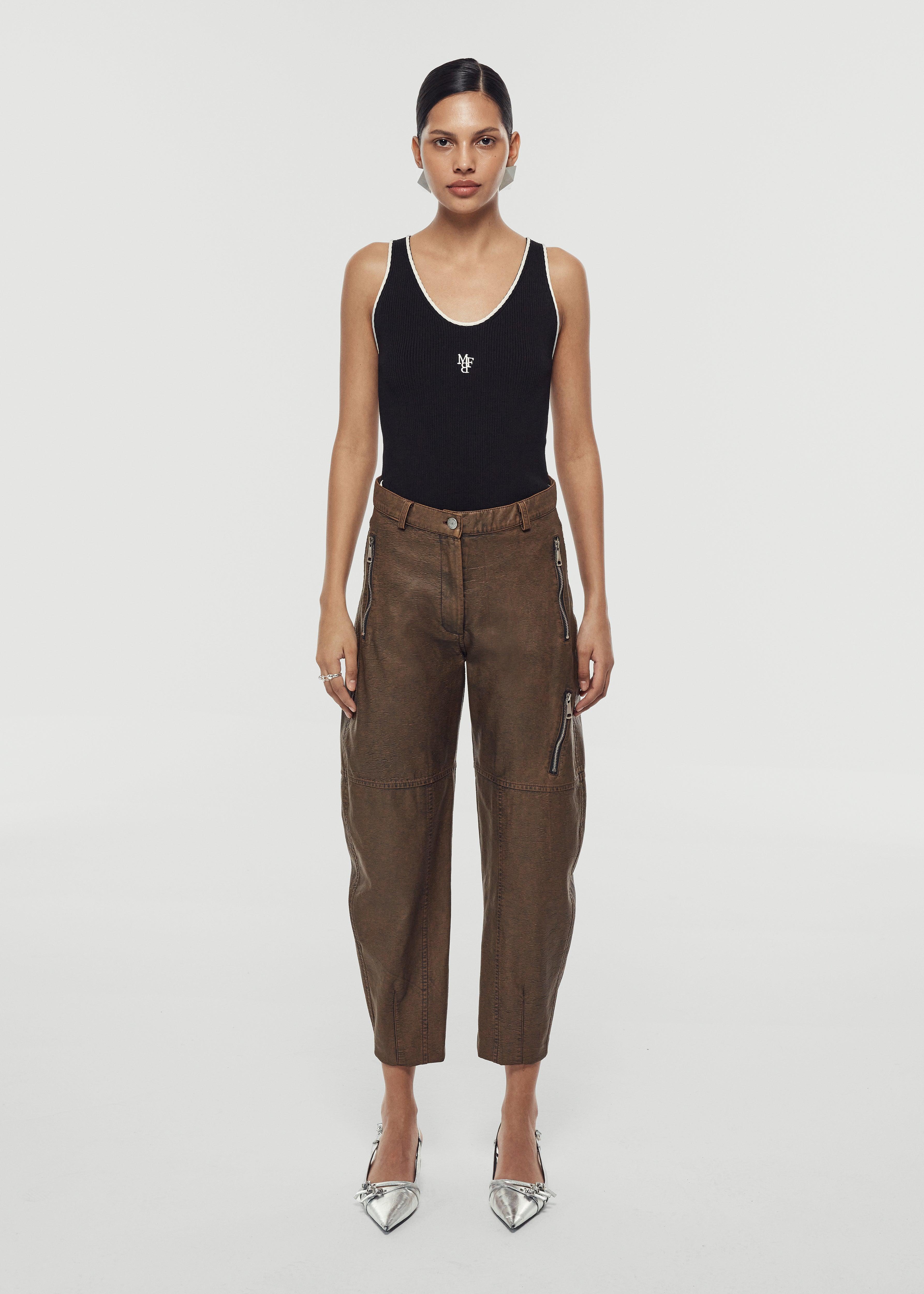High waist design, carrot cut leather trousers with metal zipper detail.
