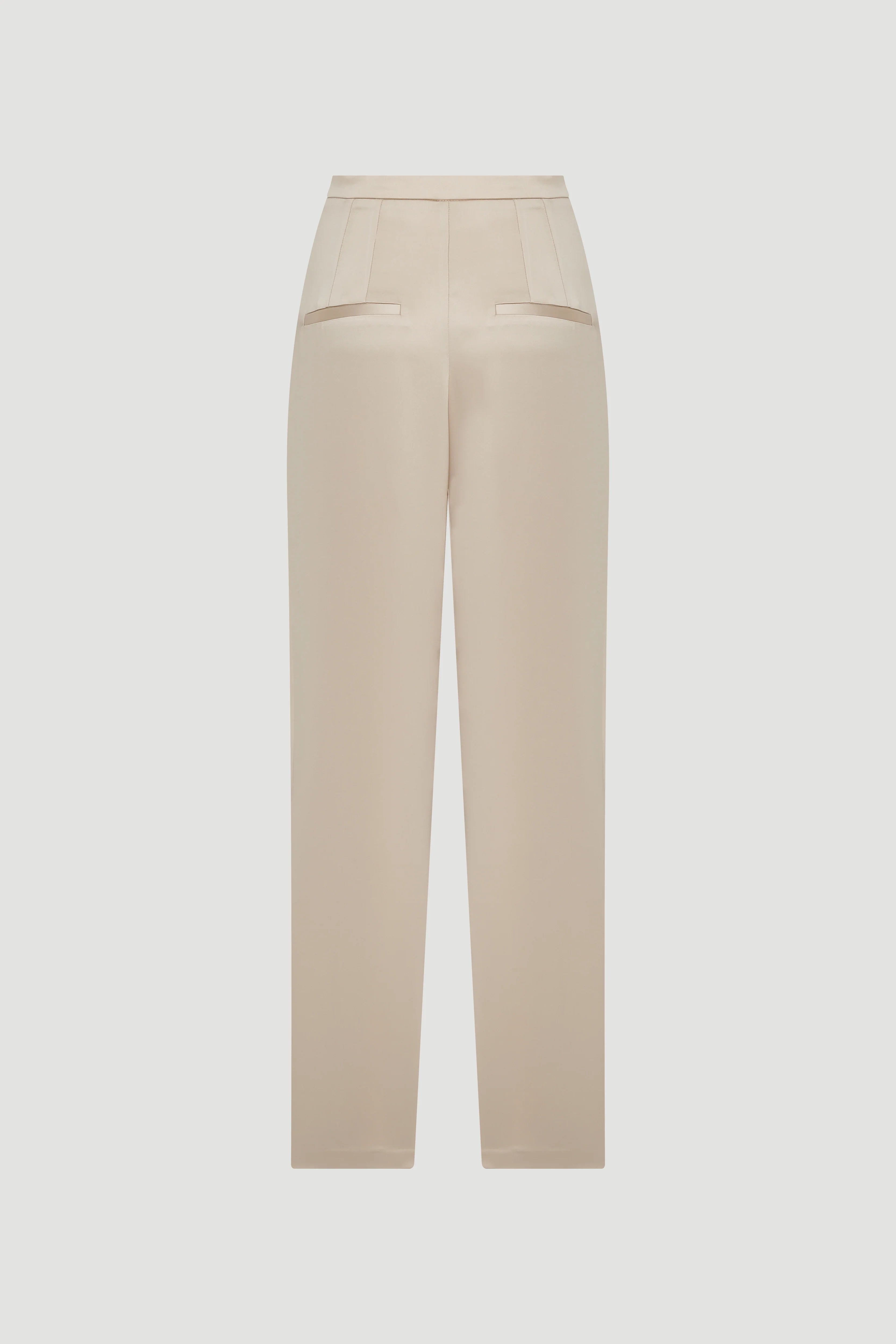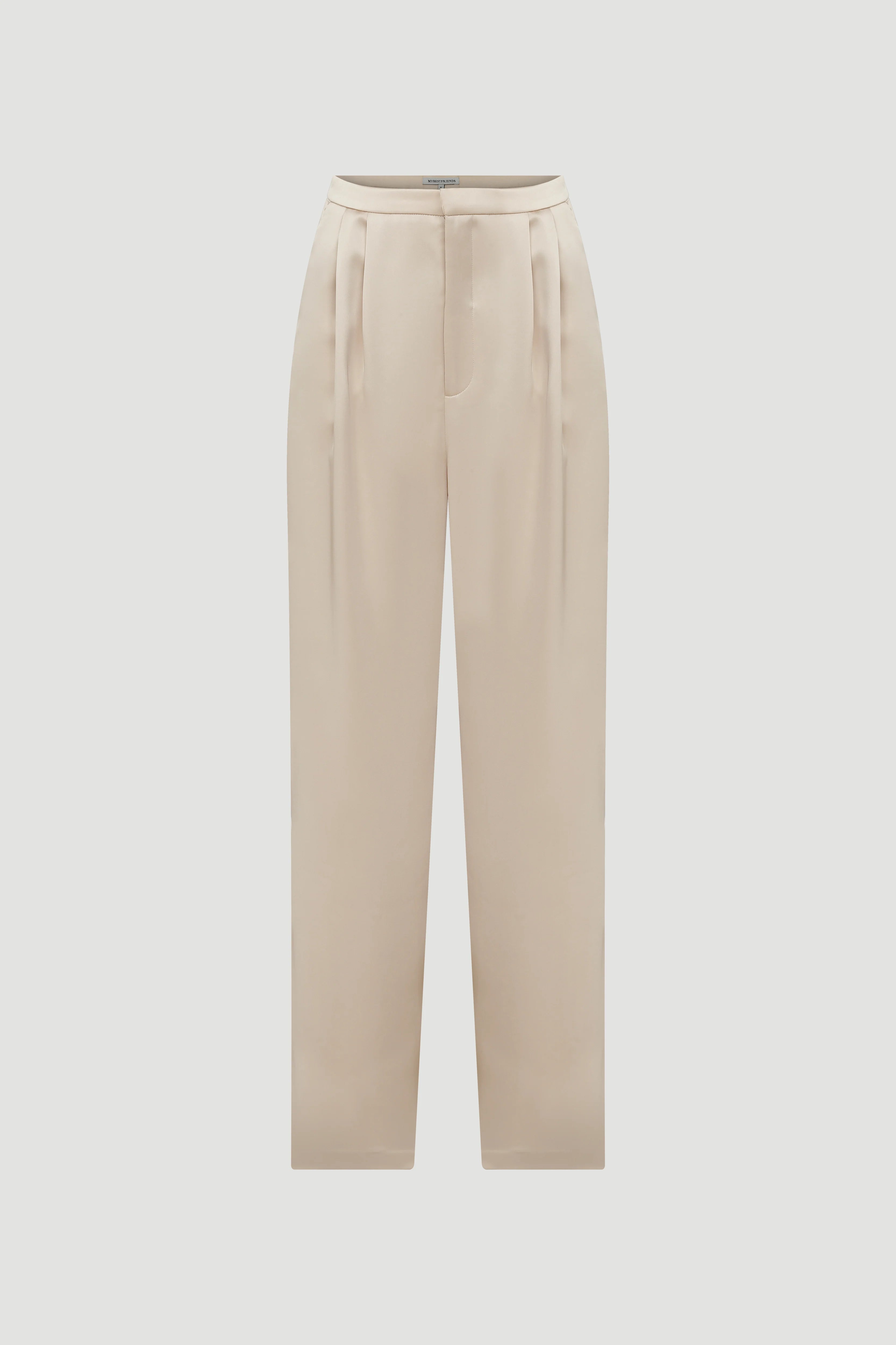 It is a trouser that stands out with its pleat details and thin belt. It has a pattern that fits at the waist and expands towards the legs. These trousers are made of crepe fabric.