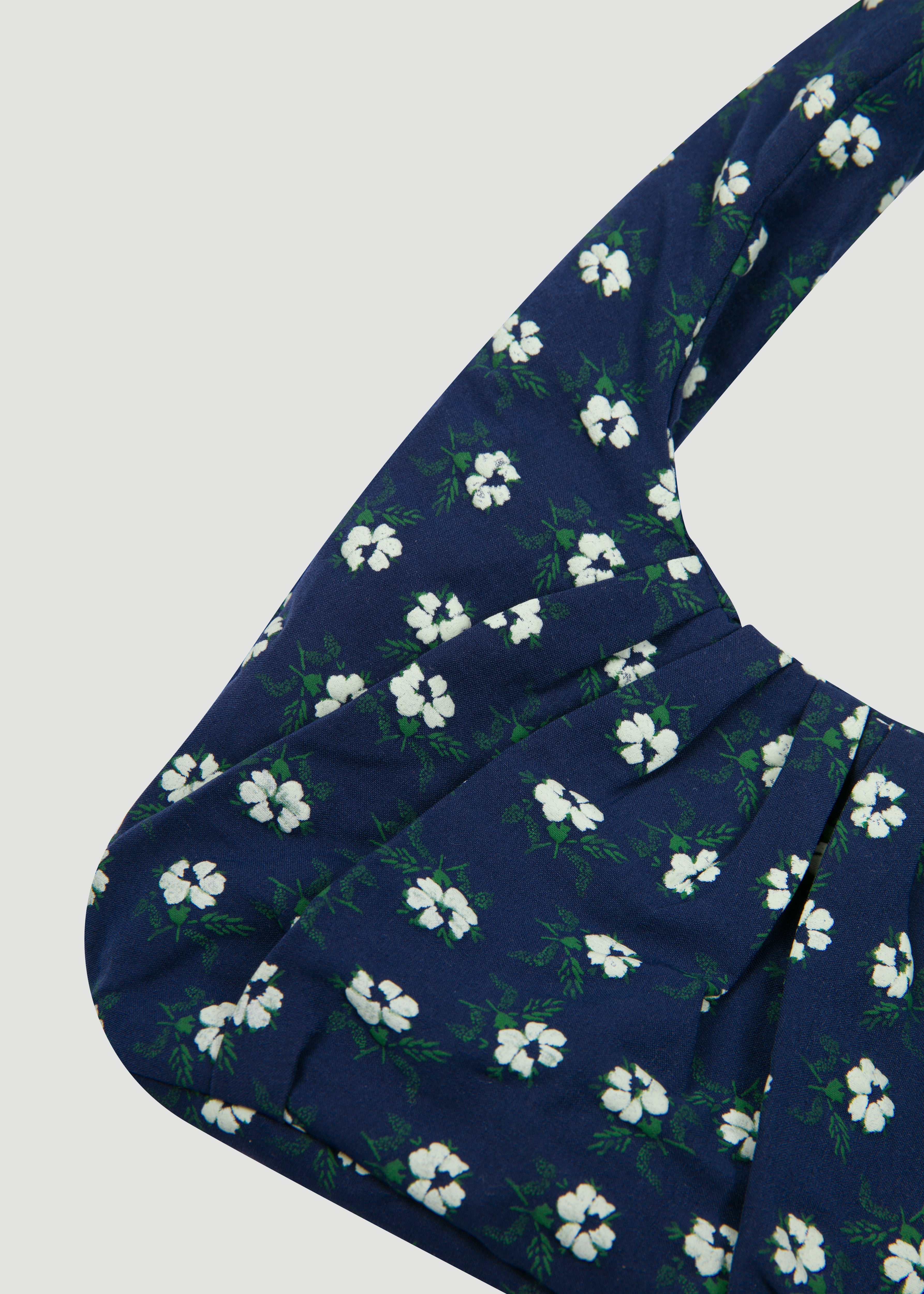 Fabric bag with gathers and ribbon details.