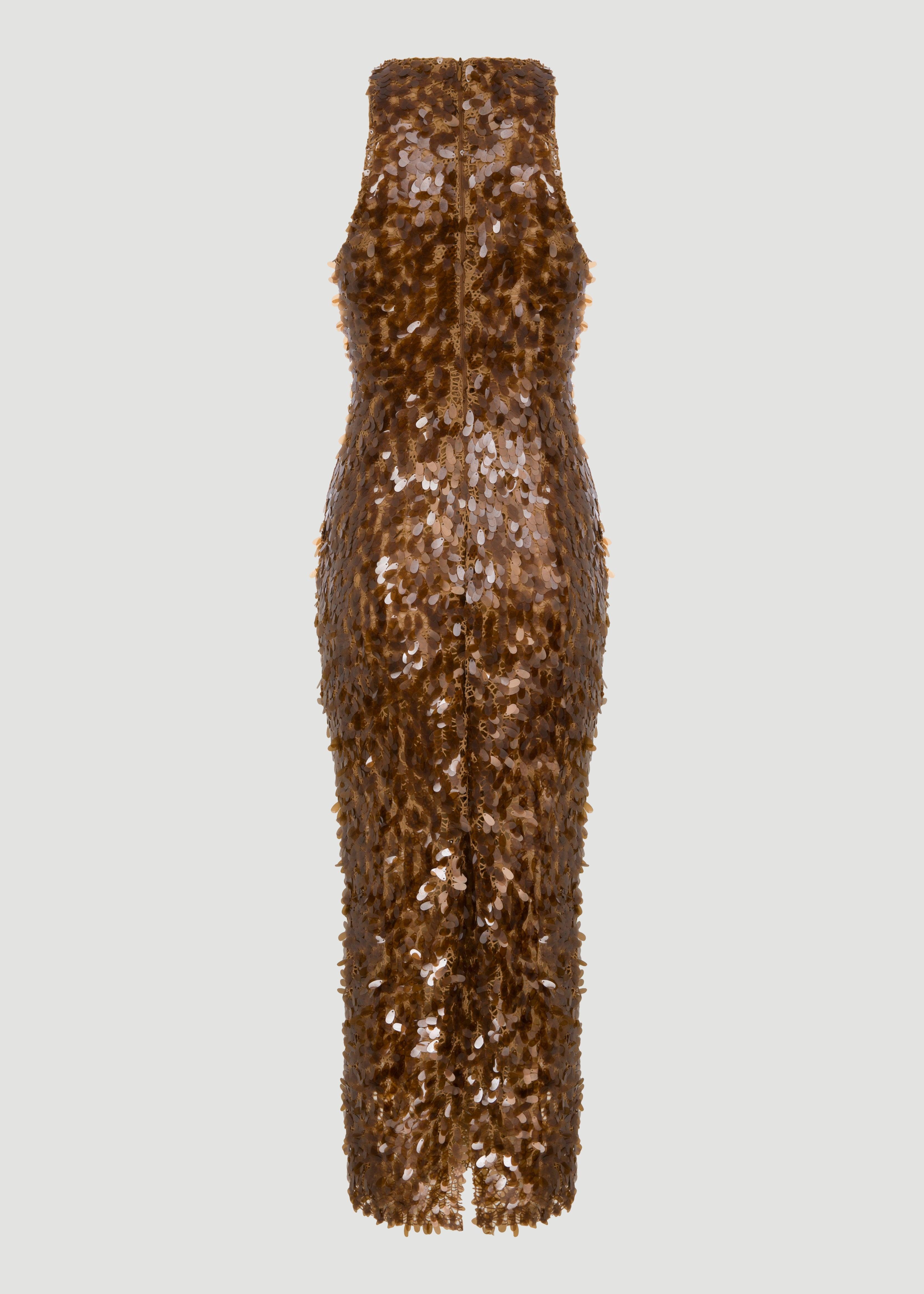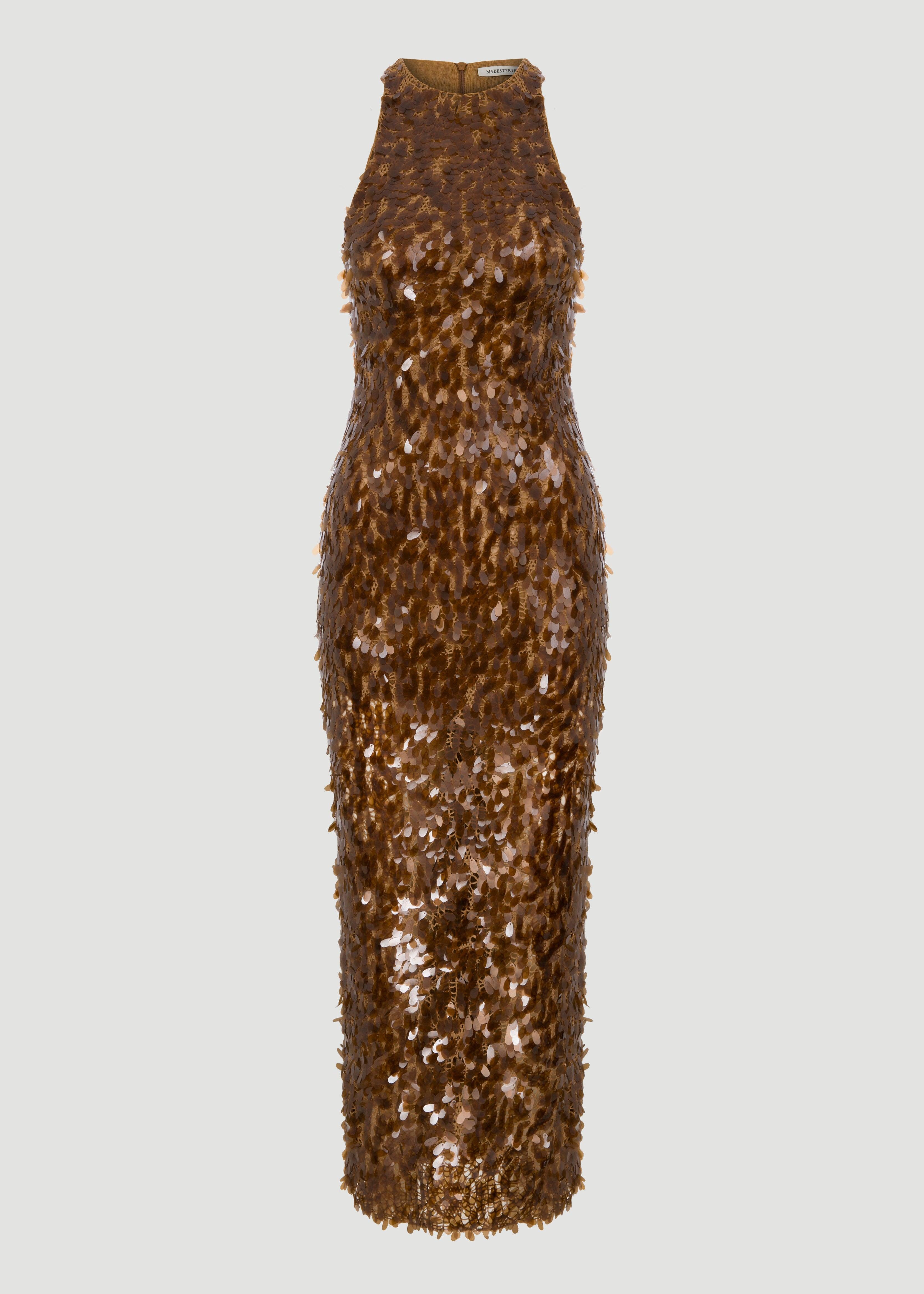 Long, sequin, body-hugging halter dress.