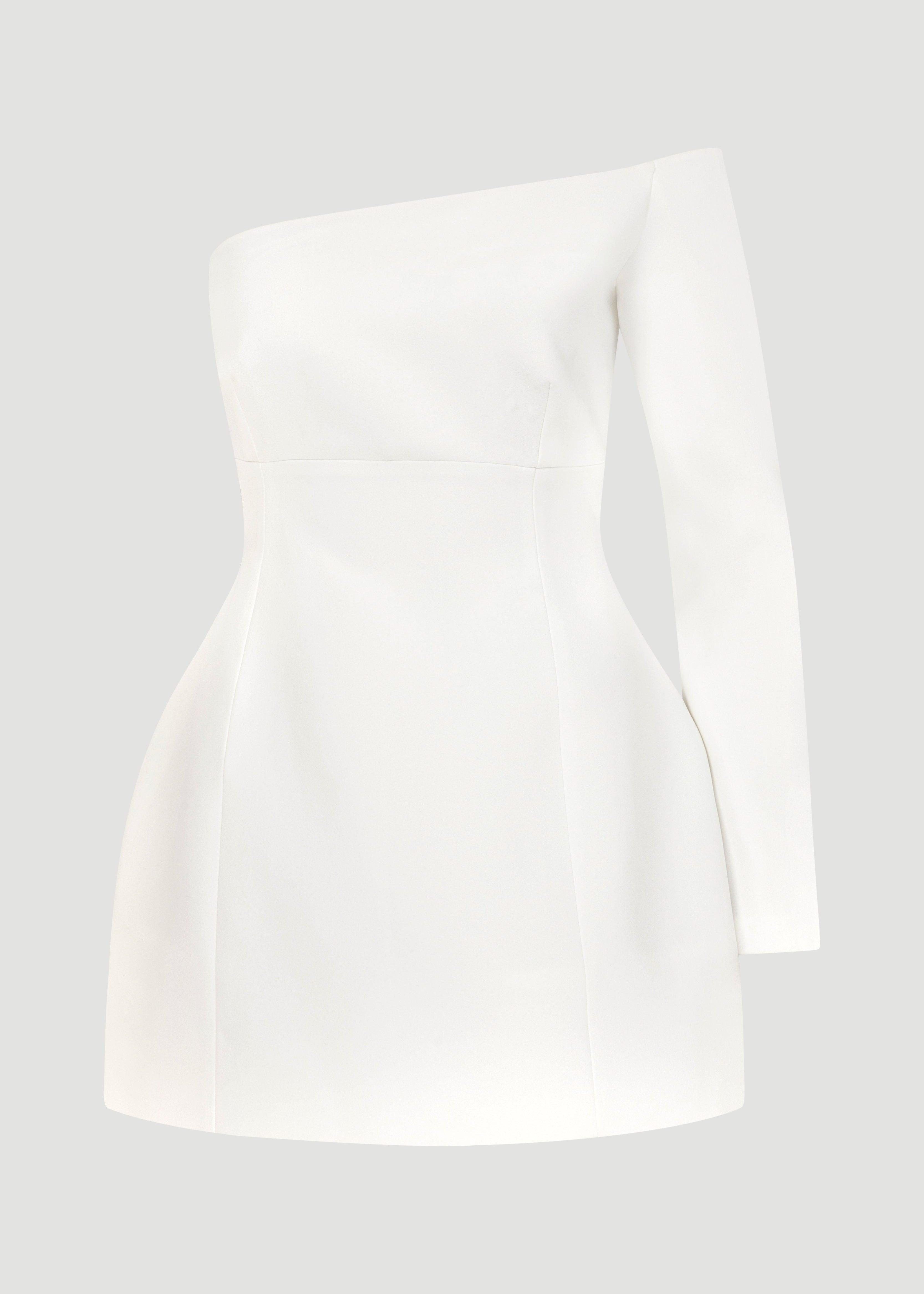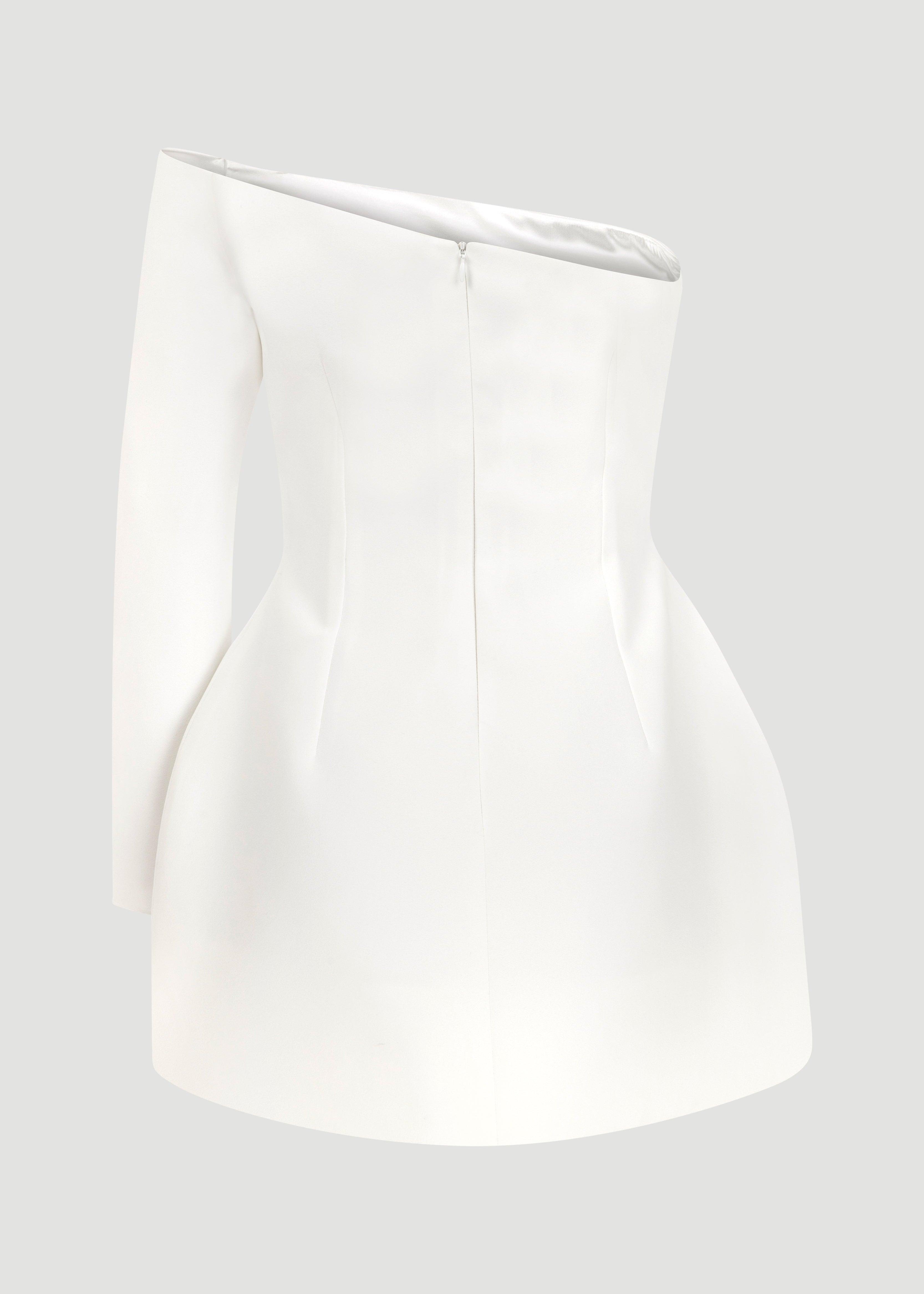 One-sleeved mini dress with wide skirt.
