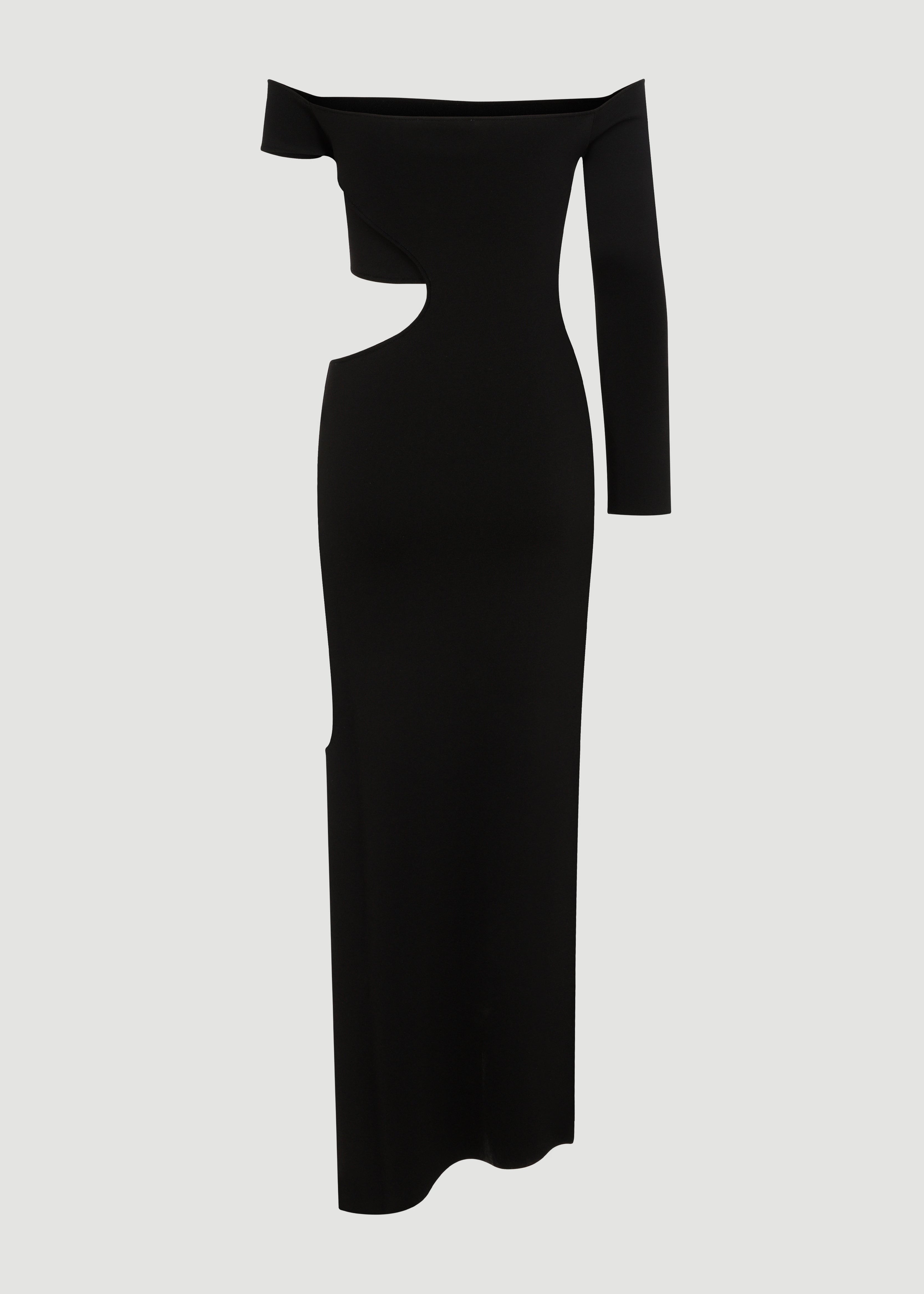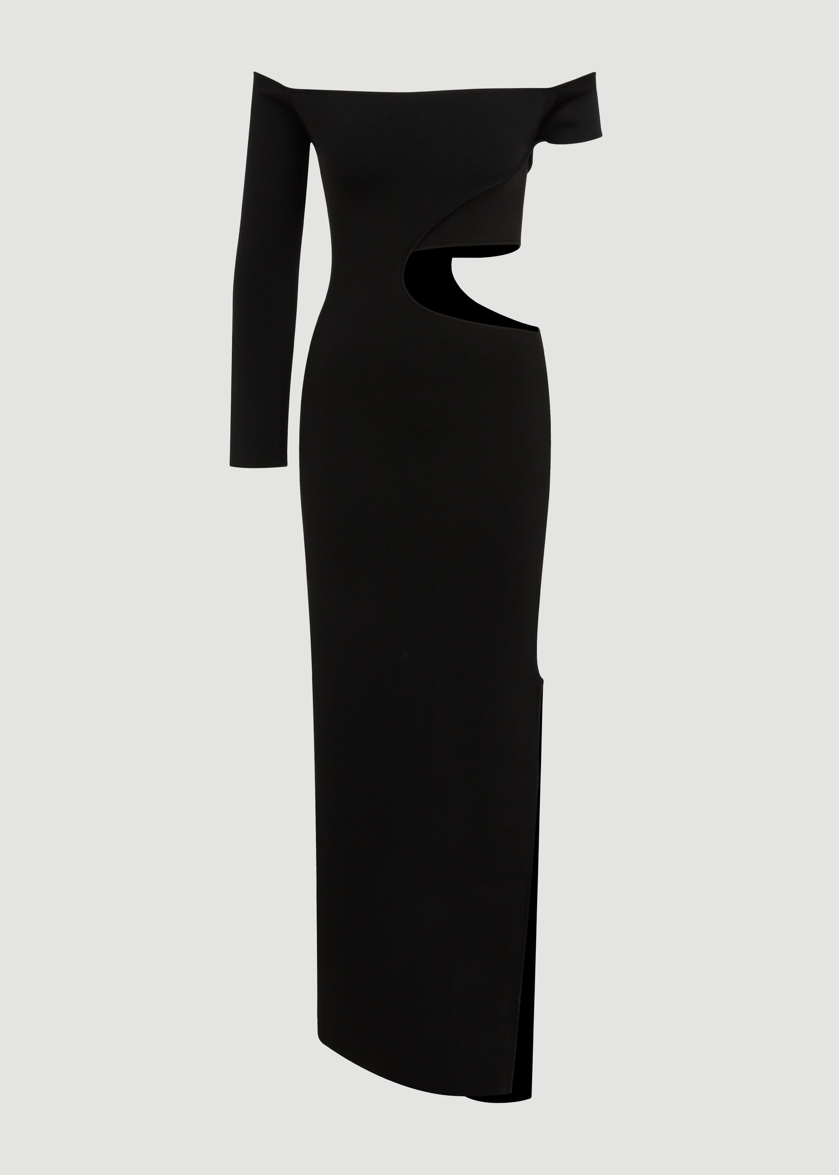 Asymmetrical cut, deep cut-out detail, slit, one-sleeved dress.